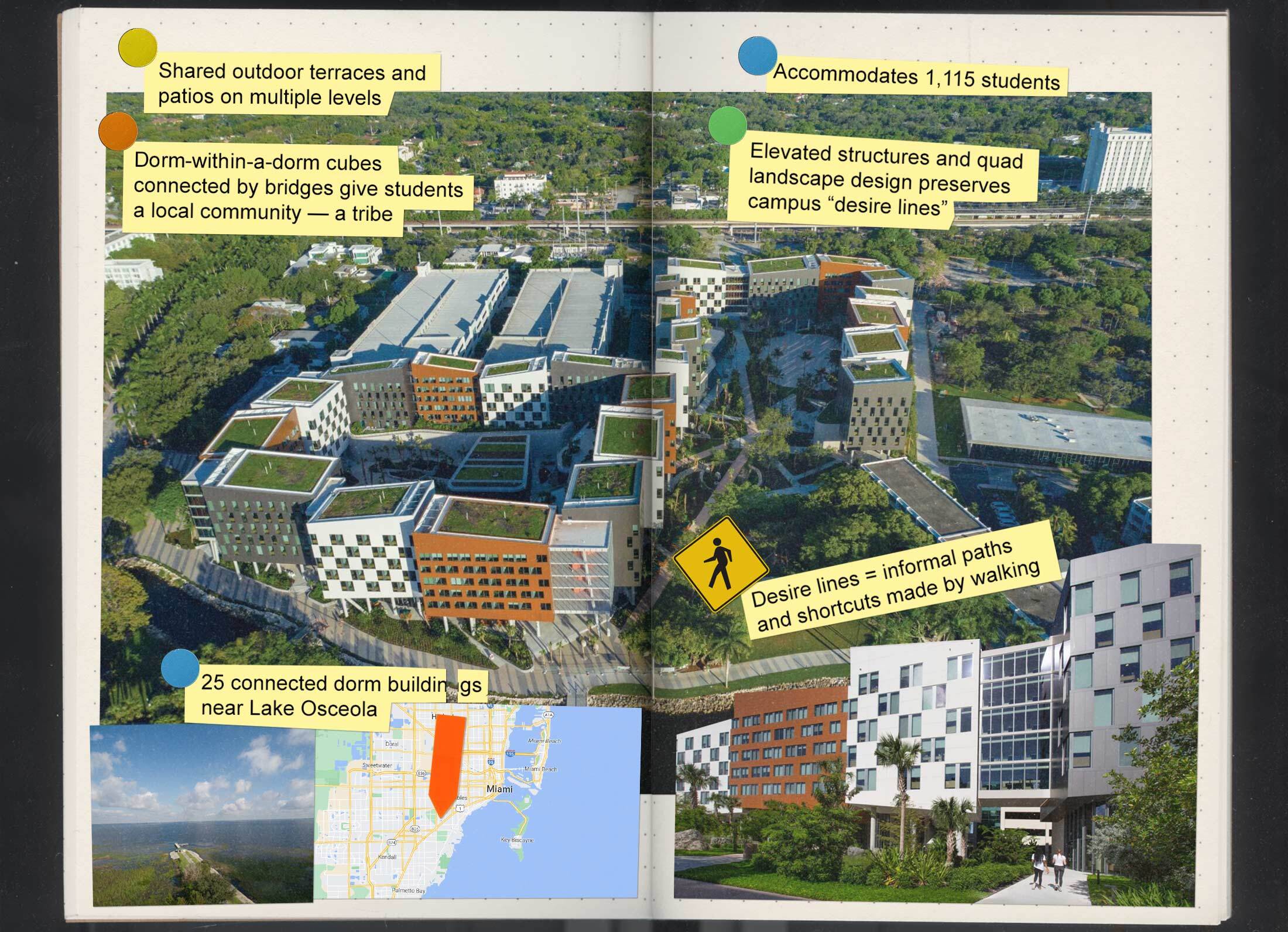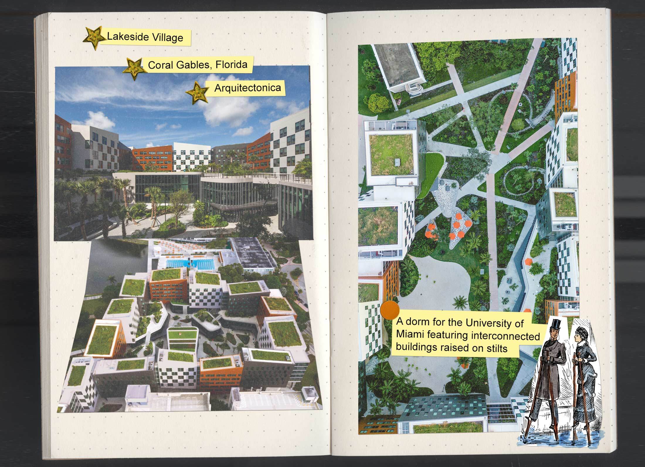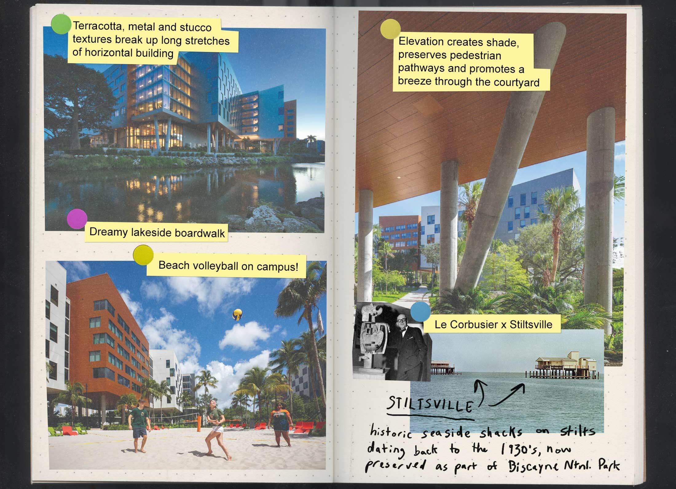 在鼎盛时期,Stiltsville有超过两打这样的架空简陋小屋,如今仅有七座幸存,成为当地骄傲和持久神话的来源。对于迈阿密建筑事务所阿奎特克图尼卡的创始合伙人贝纳尔多·福特-布雷西亚来说,Stiltsville直接启发了其新的迈阿密大学学生宿舍项目。2020年开放的奥西奥拉湖畔村(Lakeside Village)是一个细分为25栋建筑的宿舍,其中许多建筑都建在架空支柱上——这是为了反映海湾中的美景而进行的现代混搭。