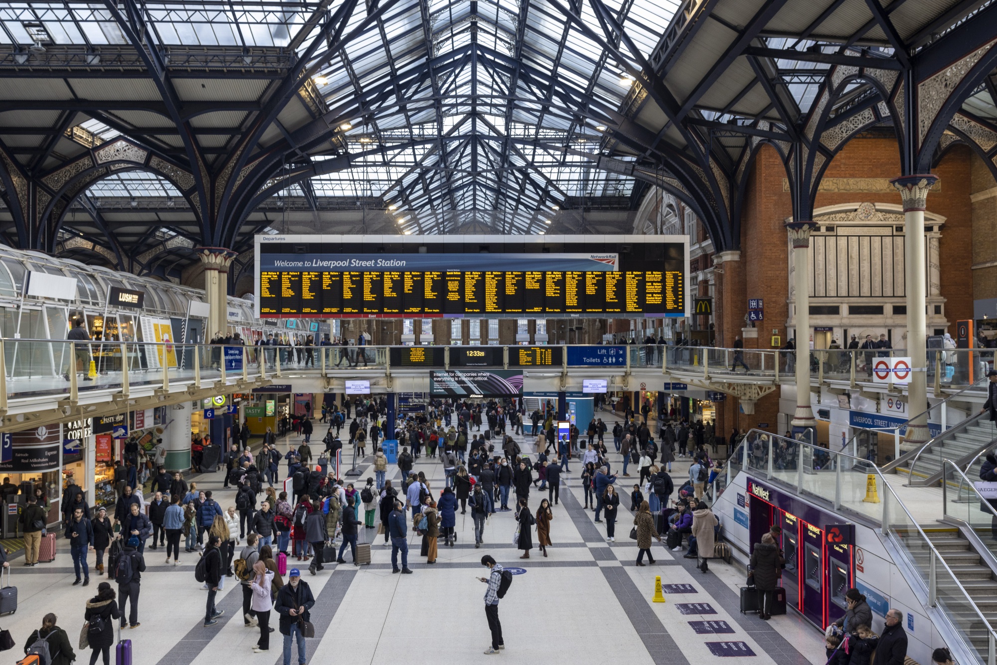 伦敦利物浦街火车站主要大厅的旅客。一项新调查显示,居家办公可能会成为常态。摄影师:Jason Alden/Bloomberg