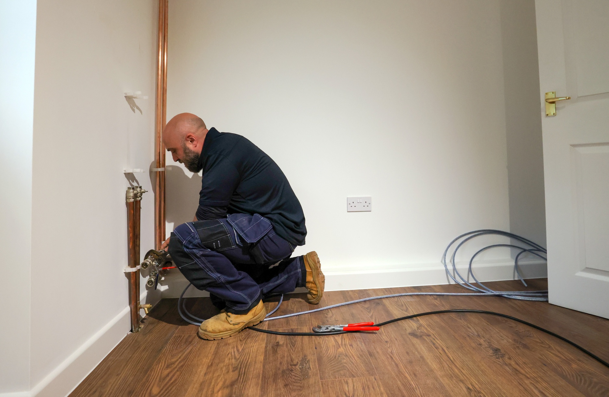 一名工程师在英国斯劳工作,安装管道并安装外部热泵。