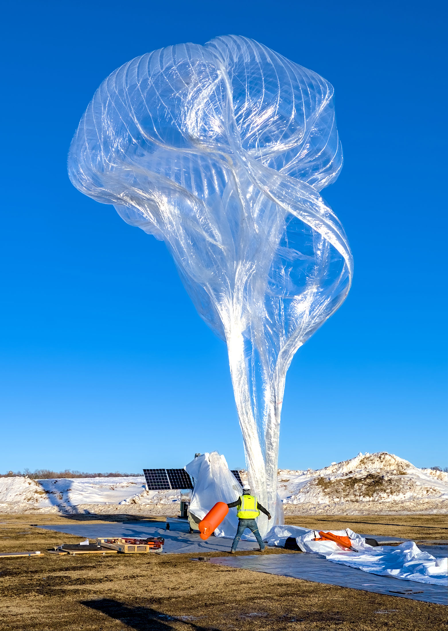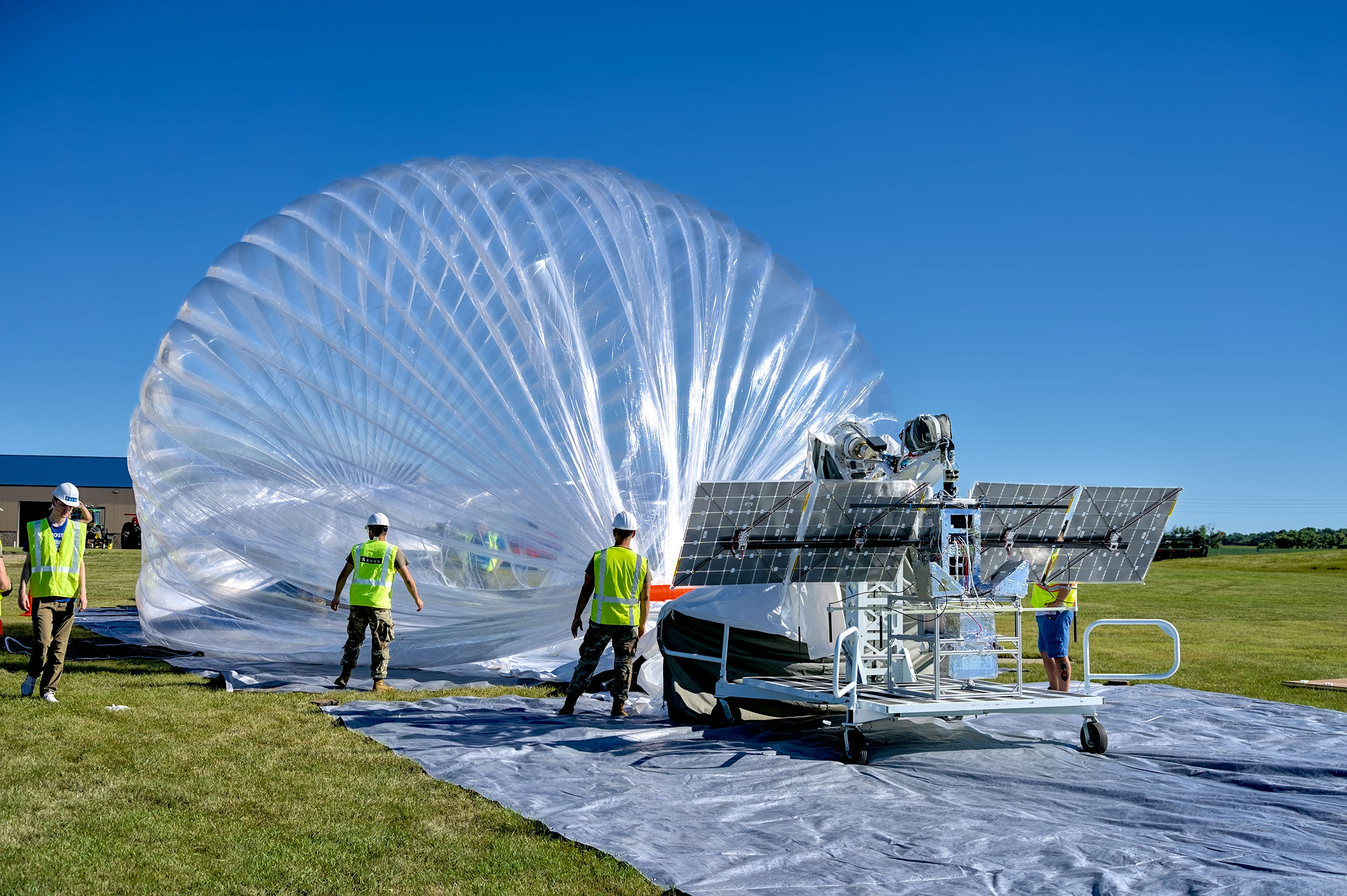 在去年夏天,就在南达科他州波罗的海附近,阿里斯塔雷风暴头气球系统部分充气,即将发射。