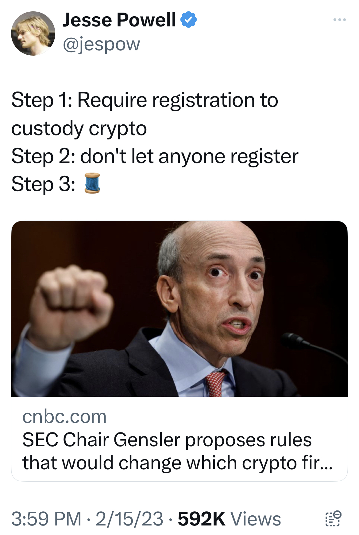 在FTX破产之后,该行业正在吸取一些艰难的教训。换句话说,仅仅说你正在将客户资产与交易所资金隔离,或者说你的账目正在接受定期独立审计已经不再足够——你必须能够提交文件证明这一点。这就是证券交易委员会现在要求任何寻求托管加密货币的美国公司做的事情,因为主席Gary Gensler试图缩小数字狂野西部与华尔街之间的鸿沟。