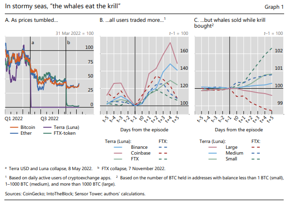 大型钱包的所有者——报告称之为“鲸鱼”——在这些“冲击事件”之后减少了比特币的持有量。中等规模的投资者和较小的投资者——被称为“磷虾”——增加了他们的敞口。