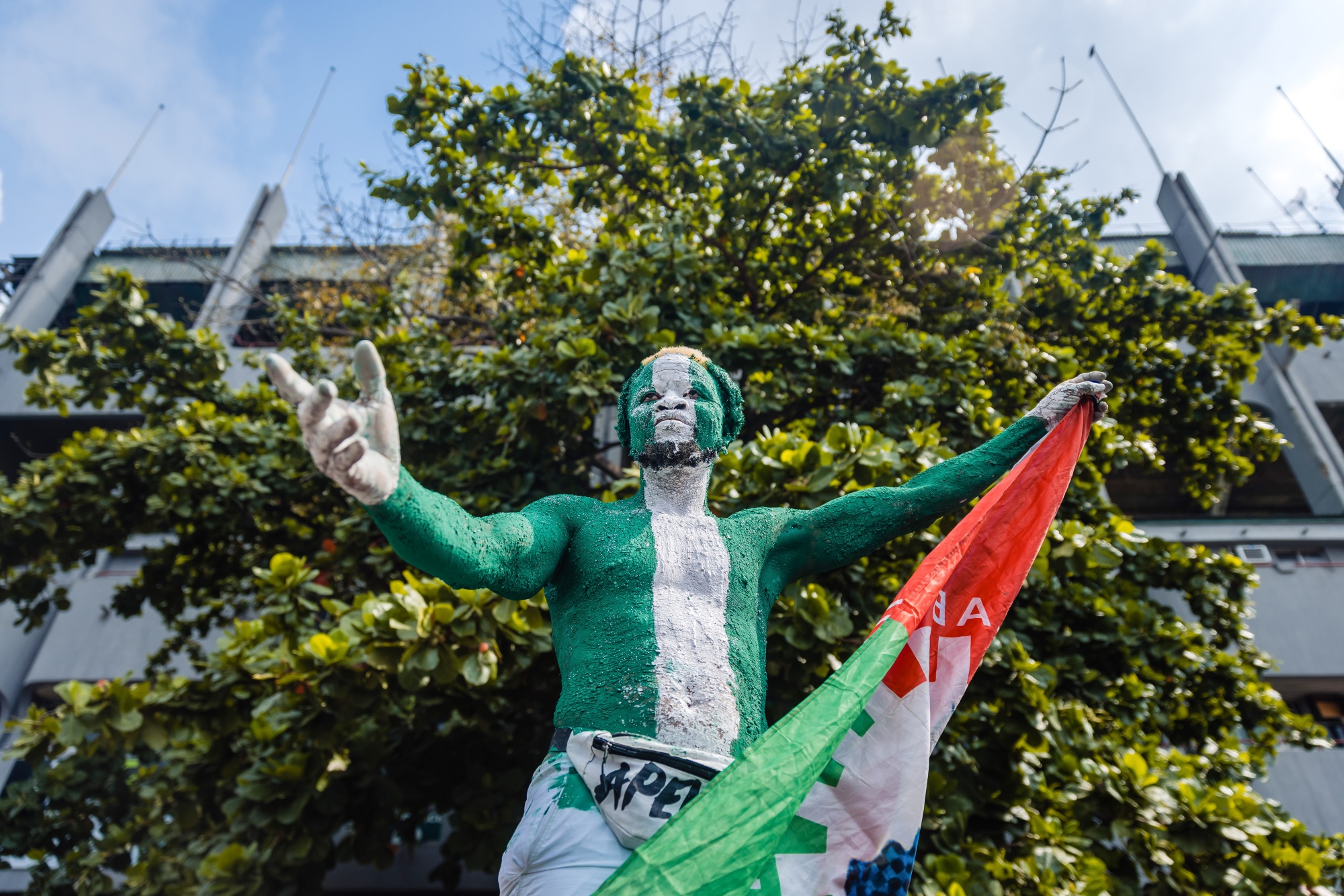 尼日利亚总统候选人彼得·奥比的支持者在2月11日身着国旗颜色进行身体彩绘。