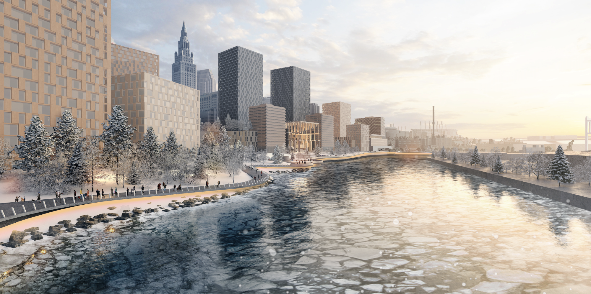库亚霍加河滨规划涵盖了35英亩的房地产,毗邻城市的前火车站和市中心地标塔城中心。渲染由阿贾耶联合公司提供