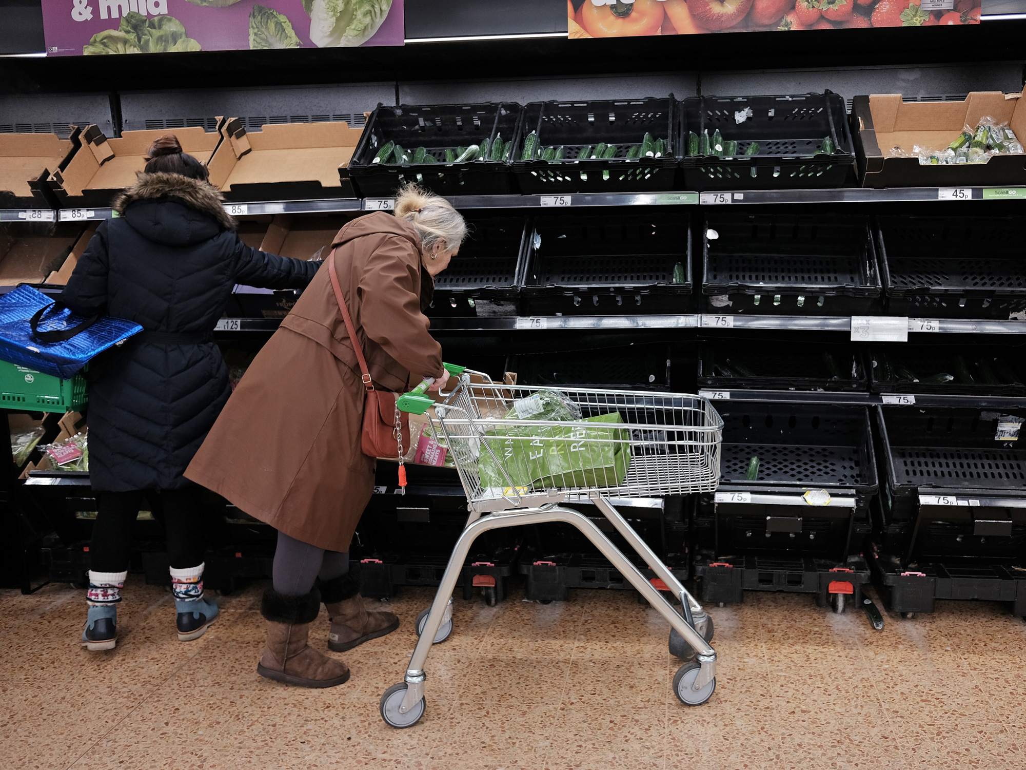 伦敦一家 Asda 商店的空荒水果和蔬菜货架。摄影师:Yui Mok/PA Wire 彭博社的食品杂货专家 Katie Linsell 为我们解释 西班牙和北非的寒冷天气扰乱了收成,导致那里的农产品生长速度比平常慢,而阻止了它成熟。