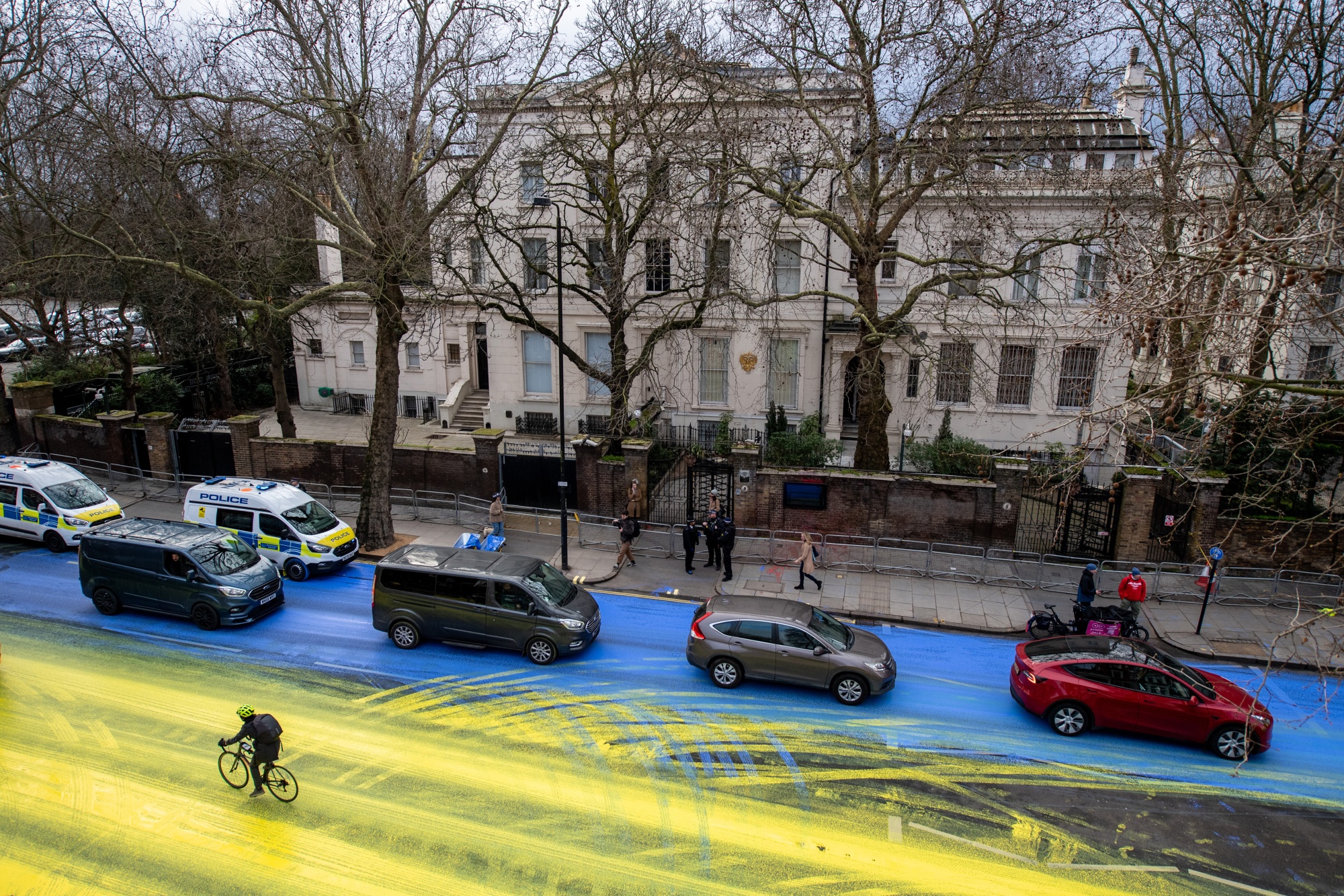 由“被驴子领导”活动人士在伦敦俄罗斯大使馆外绘制的乌克兰国旗,日期为2月23日。摄影师:被驴子领导/手稿/盖蒂图片社(请查看彭博终端上的俄罗斯制裁仪表板。)