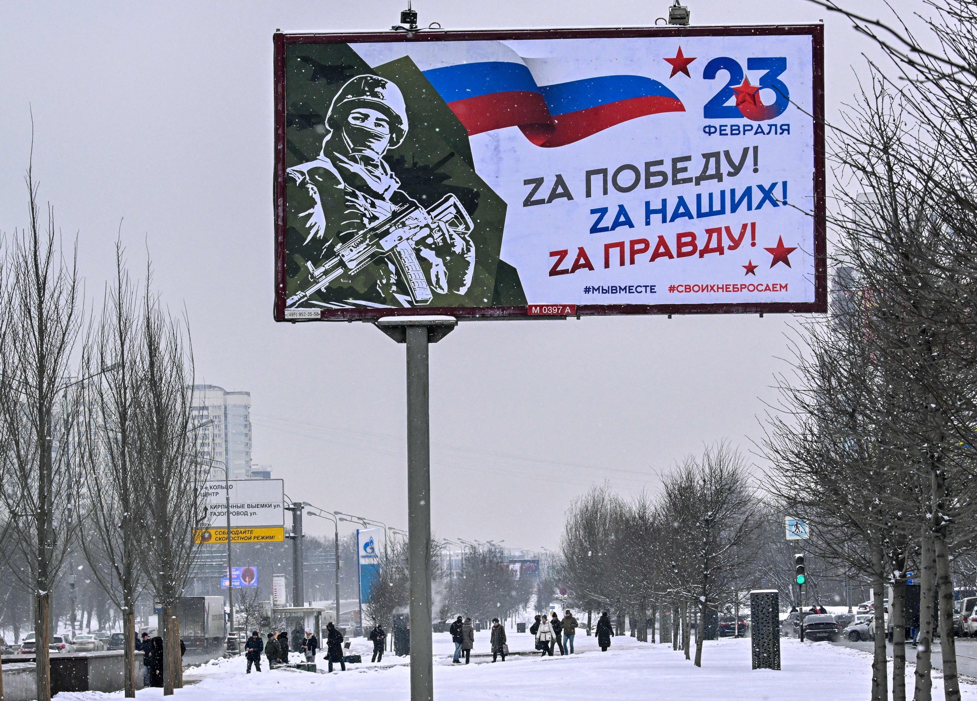 一个致力于“祖国保卫者节”的广告牌在莫斯科街头上写着“为了胜利!为了我们!为了真理!”