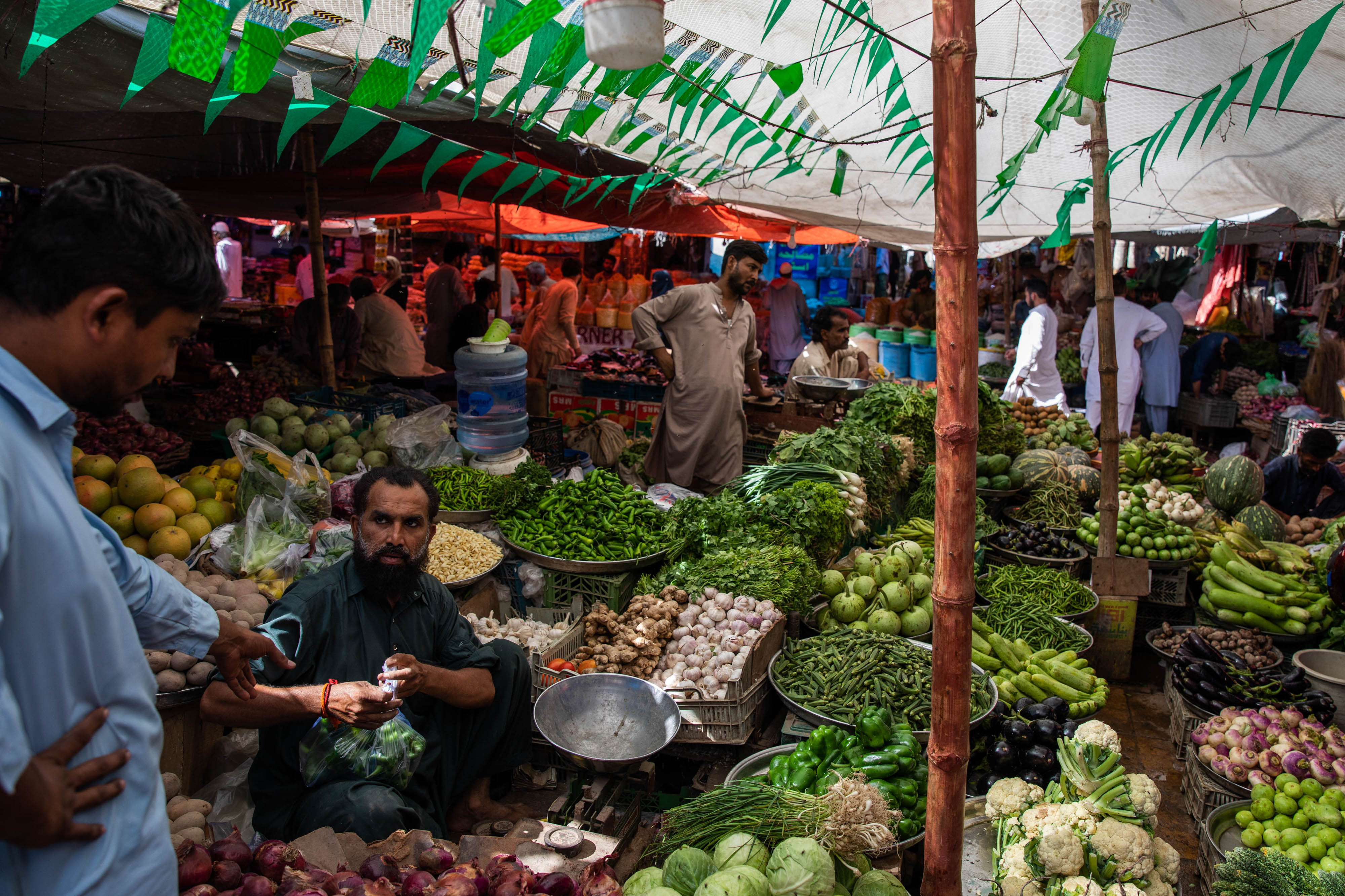 供应商在巴基斯坦卡拉奇的皇后市场出售蔬菜和其他商品。