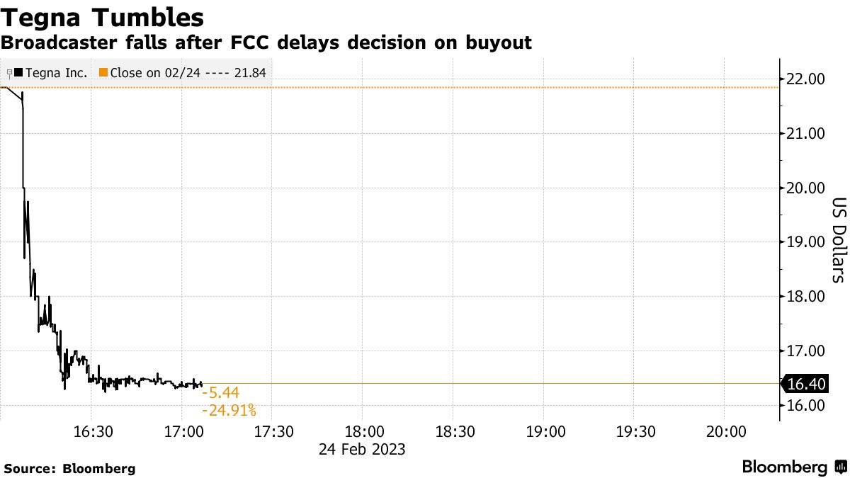 Tegna的股价在公告发布后的延长交易中下跌了多达26%,至16.15美元。Standard General为该公司提供每股24美元。