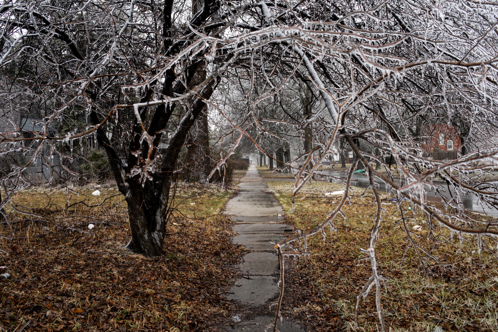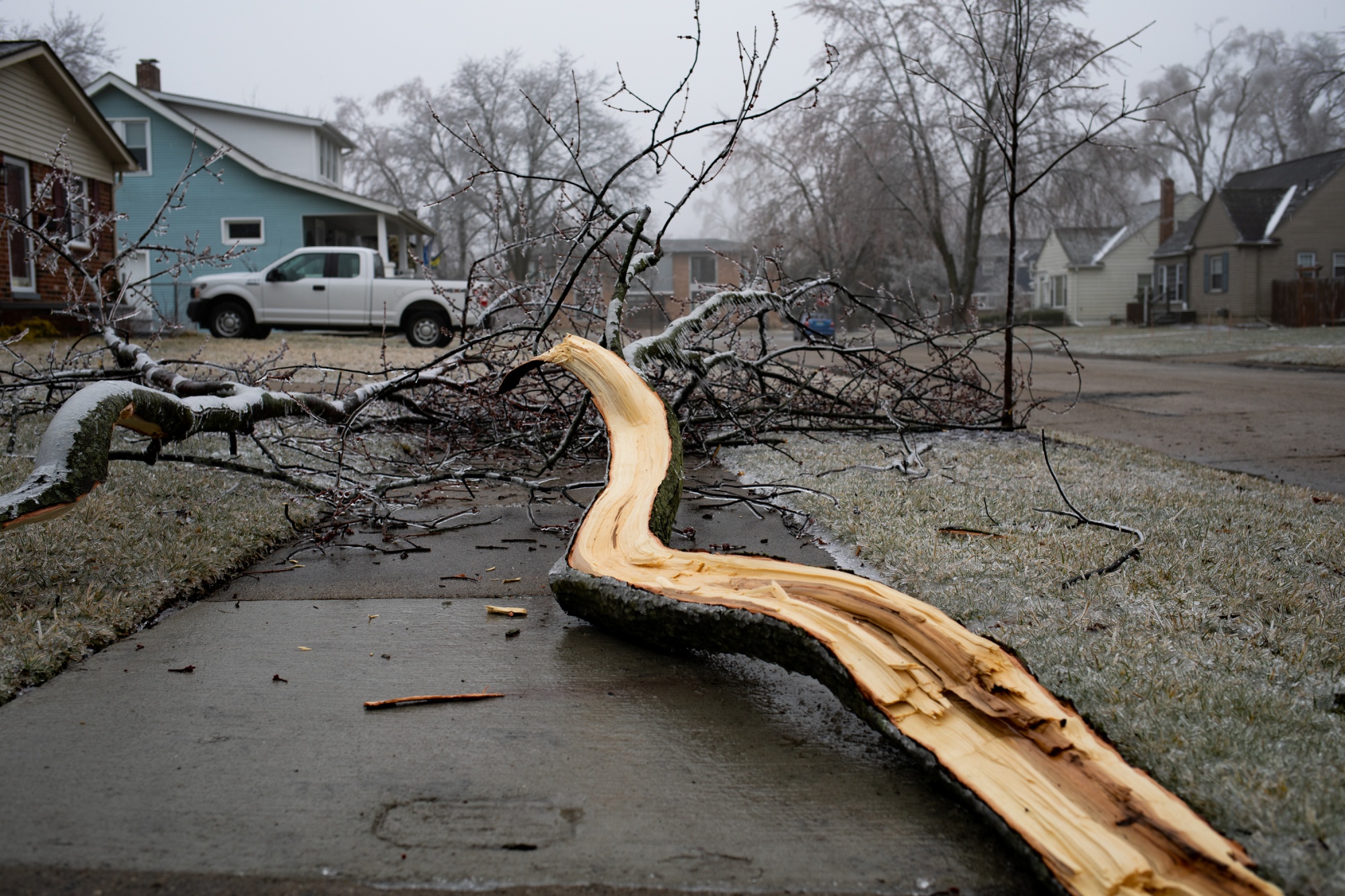 底特律都会区的DTE能源公司表示,暴风雨过后其电力系统遭受了严重破坏,约有2,000条电线倒下。冰的积累可能使一段电线增加超过1,000磅(450公斤),相当于一架三角钢琴的重量。
