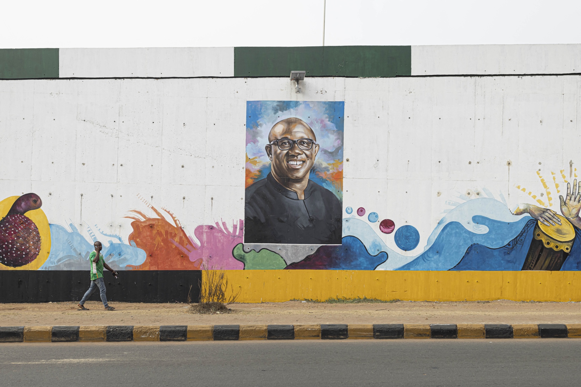 在尼日利亚奥卡市,一幅描绘彼得·奥比的壁画,拍摄于2月24日。