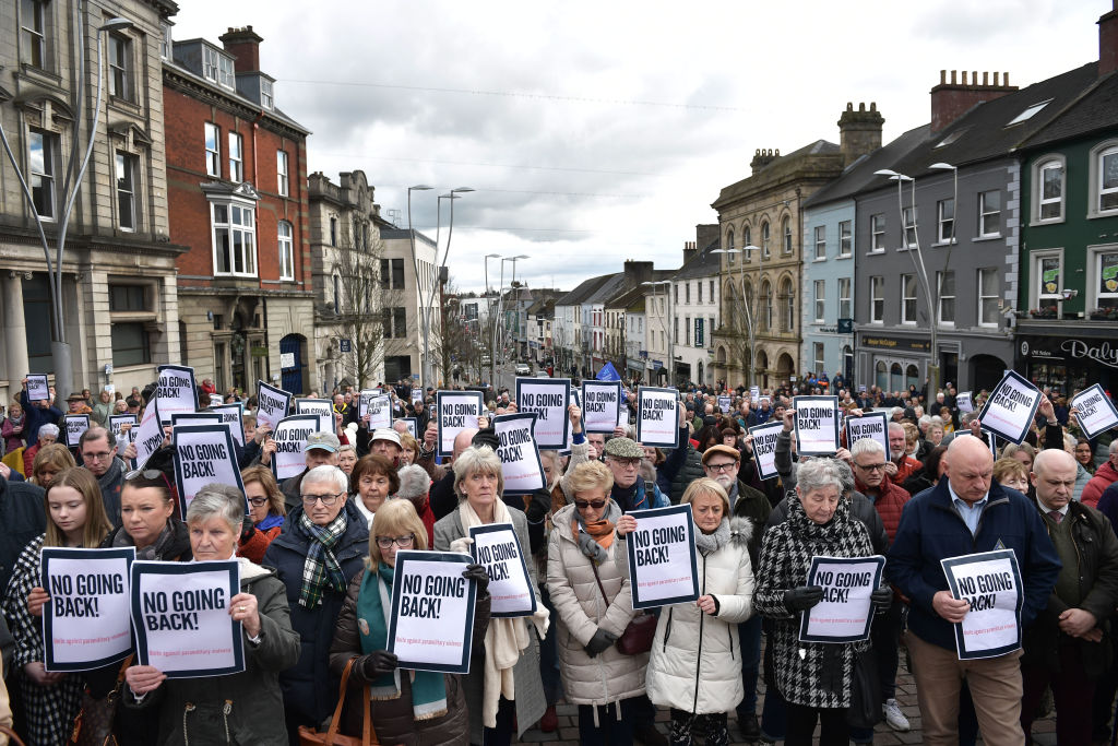 距离1998年一个分裂的共和主义炸弹杀死29人,其中包括一名怀孕双胞胎的妇女的地方不远,他们举着写着“不会倒退”的海报。