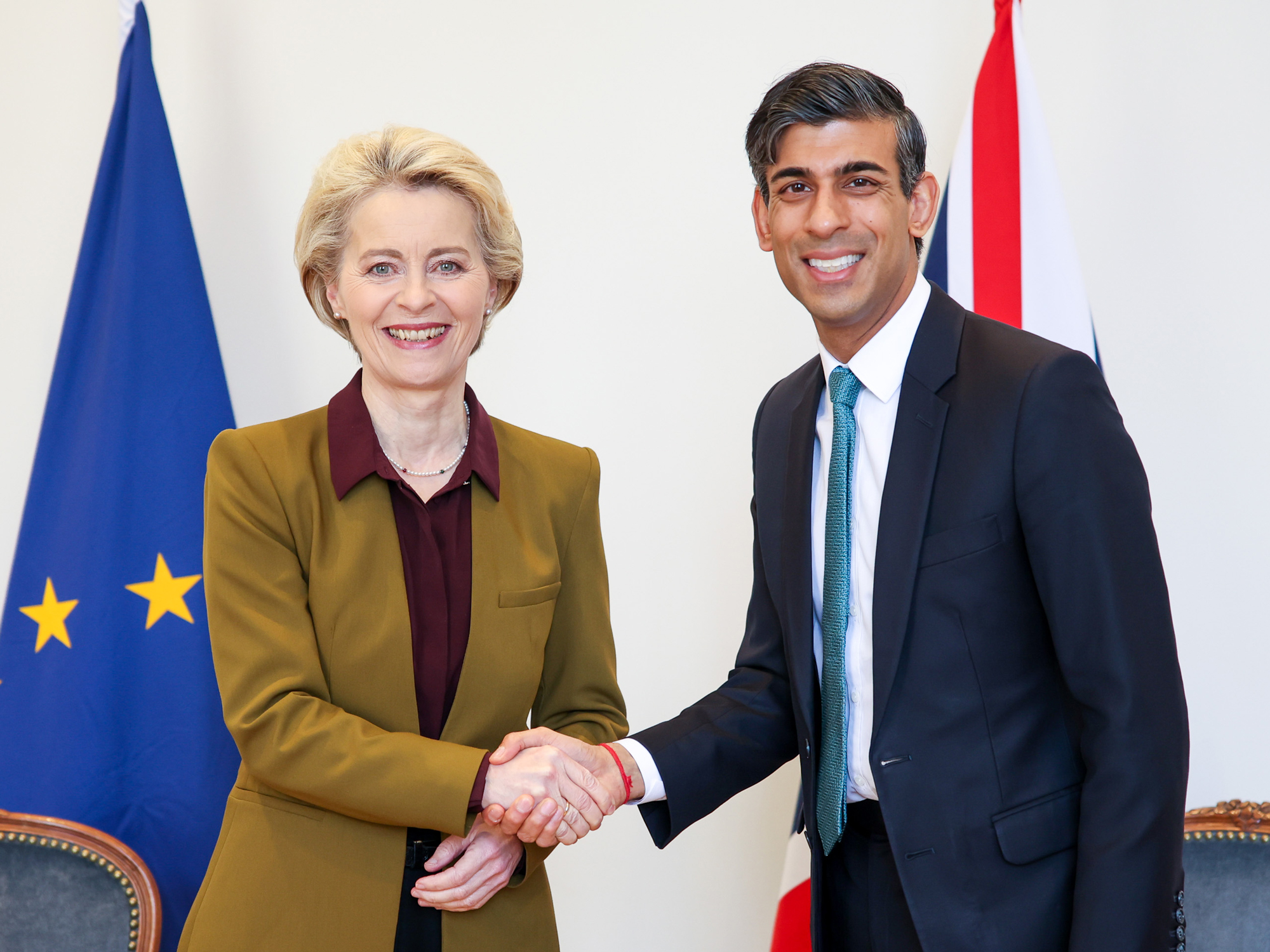 乌尔苏拉·冯·德·莱恩和里希·苏纳克于2月18日在慕尼黑。摄影师:克里斯托夫·利科普/欧洲委员会新协议旨在通过围绕从英国流向北爱尔兰并继续流向欧盟的“绿色”和“红色”海关通道的解决方案来软化这些贸易和监管障碍。这将结束英国境内货物的繁琐检查和文书工作。