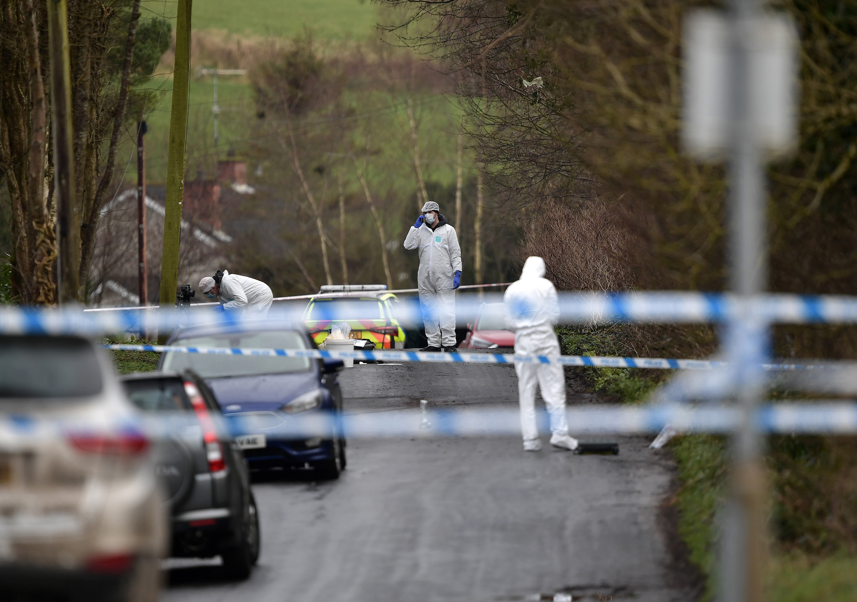 警察和法证人员在2月23日的北爱尔兰奥马的体育中心枪击案现场。