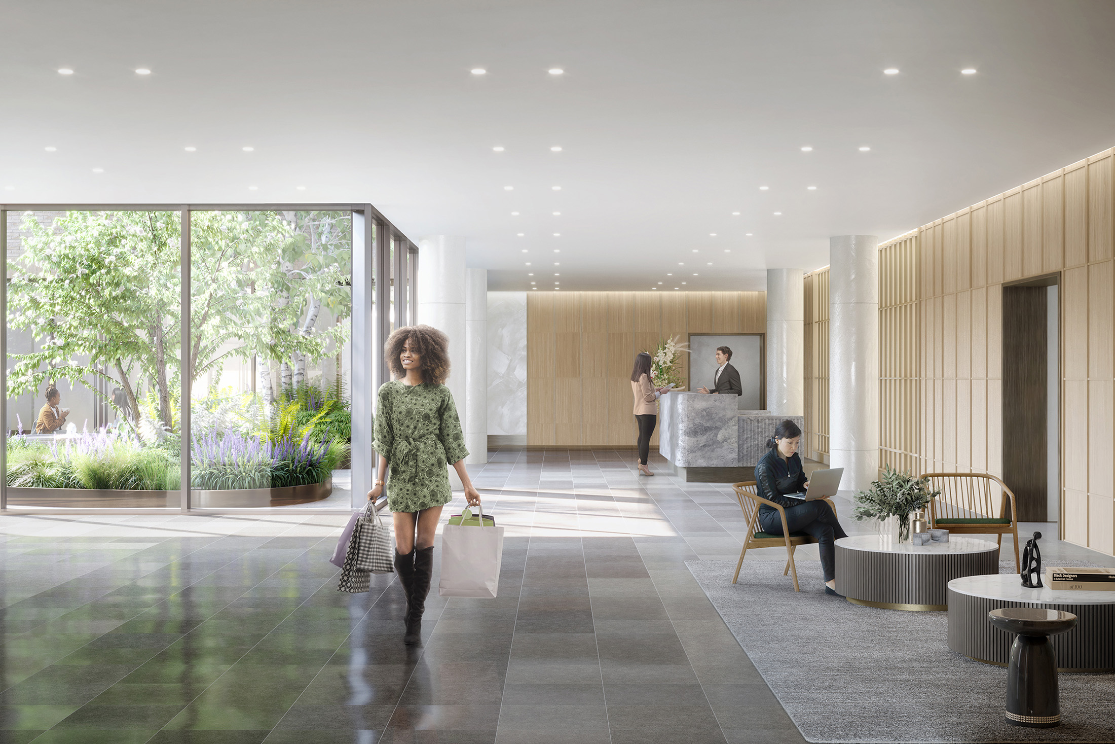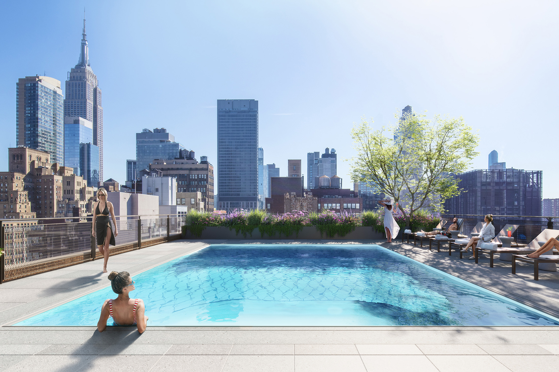 这两座塔楼之间有一个70英尺(21米)宽的庭院,种满了绿植和娱乐区,供居民使用。还有一个屋顶露台和游泳池,以及一个面积为5,000平方英尺(465平方米)的健身中心。大约有10%的单位拥有私人户外空间。
