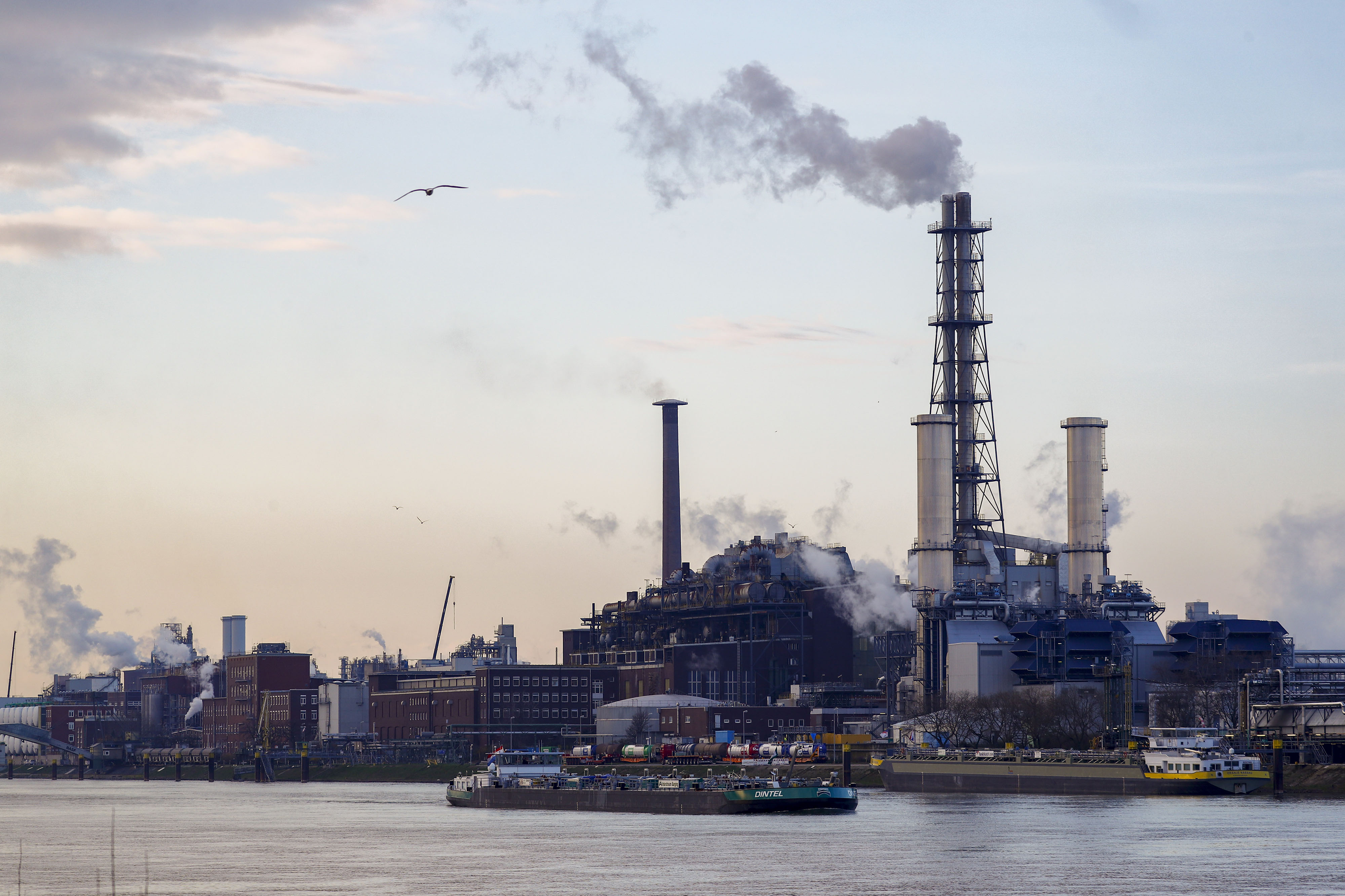 一艘驳船驶过德国路德维希港莱茵河上的巴斯夫化工厂。