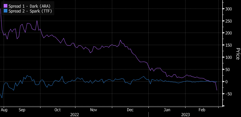 - 图表显示,燃烧煤炭(深色)和天然气(浅色)生产电力的相对盈利能力在2023年7月的交付中发生了转变: