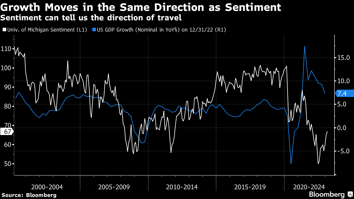 经济增长的变化不像情绪那么激烈,情绪不能预测衰退,但两者大多数情况下是同向运动的。
