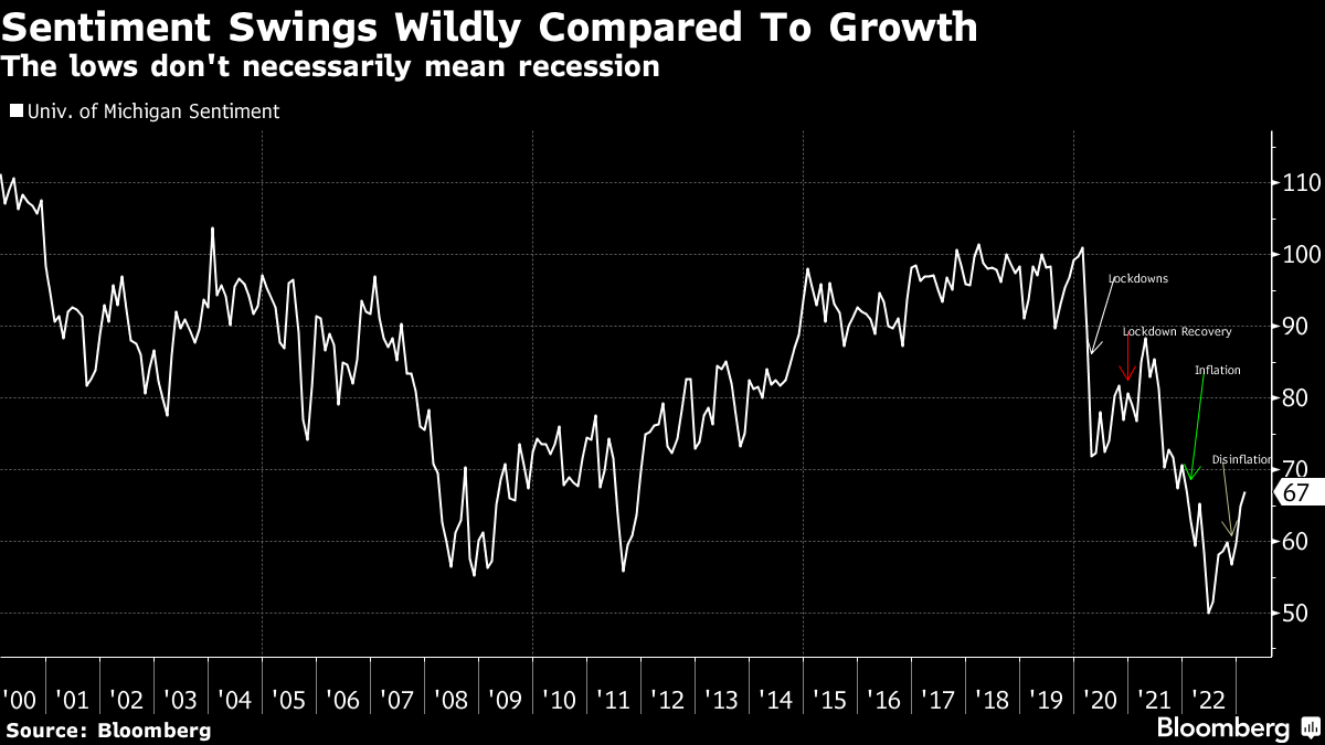 此后通货膨胀有所降温,消费者情绪也有所改善。但水平仍然相当低。我的问题是:情绪低迷,即一切似乎都在走下坡路,是否会导致真正的衰退?我一直在研究数据,得出的结论是,情绪低迷并不一定会转化为真正的衰退。基本上是软性数据和调查结果与销售和支出等硬性数据之间的差异。简而言之,消费者(和企业)言行不一,这可能是经济的救命稻草。