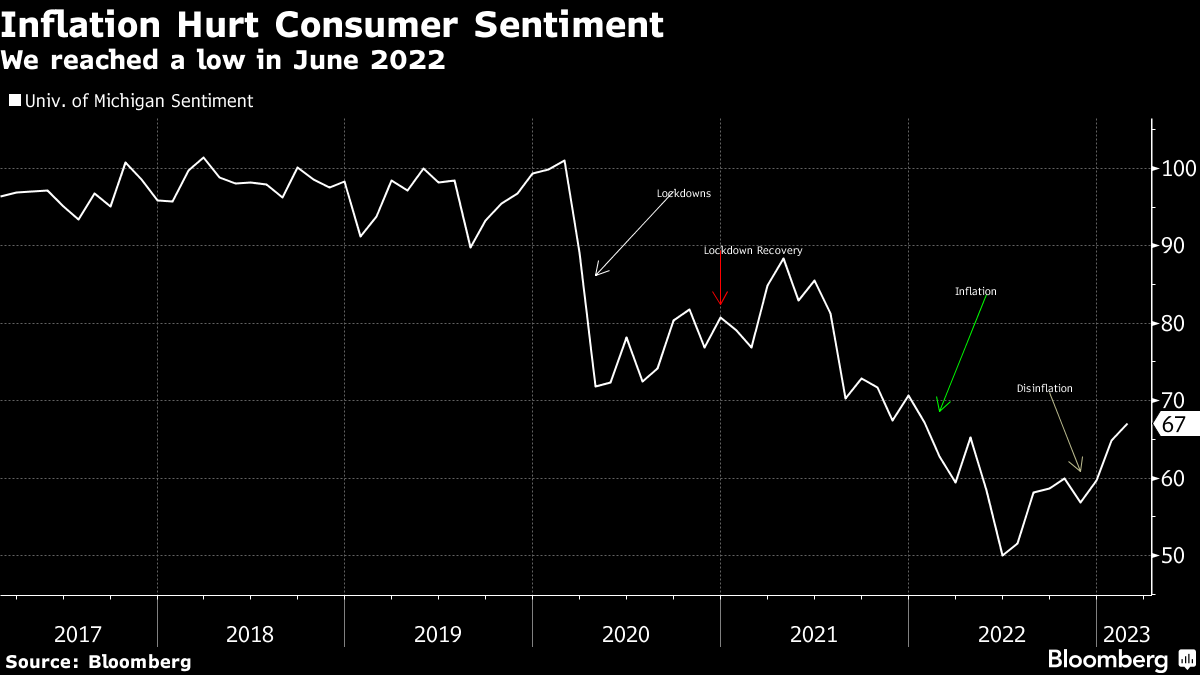自疫情爆发以来,我们经历了四个不同的消费者信心时期。首先是在2020年春季进入封锁时的暴跌。然后是一年的波动性复苏,直到2021年春季通货膨胀开始真正影响。随着通货膨胀无处不在,信心急剧下滑,并在去年六月达到最低点。但自那时以来,信心已经恢复,但仍然低于我们进入封锁时的水平。