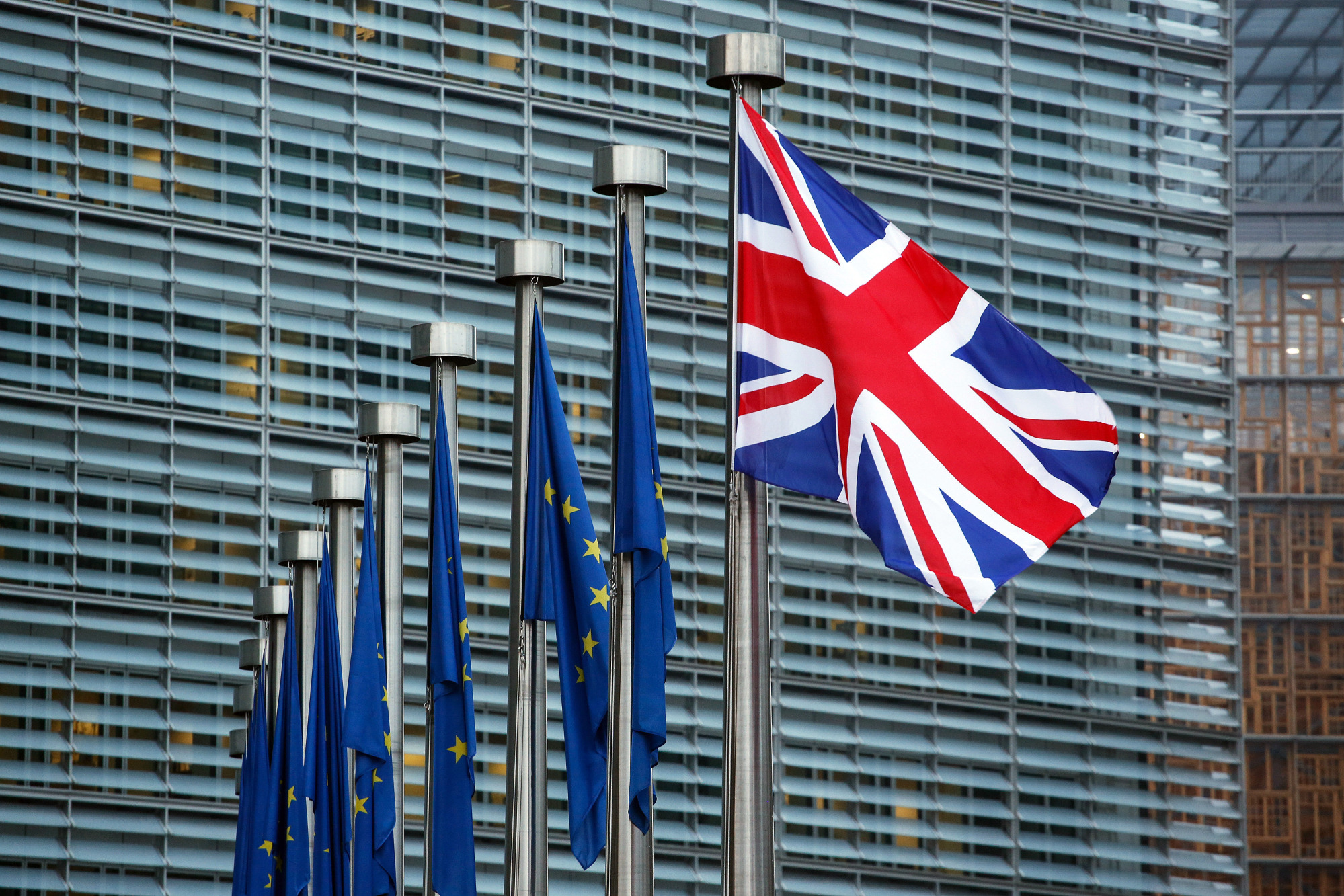 英国国旗飘扬在比利时布鲁塞尔欧盟委员会外的欧盟国旗旁。