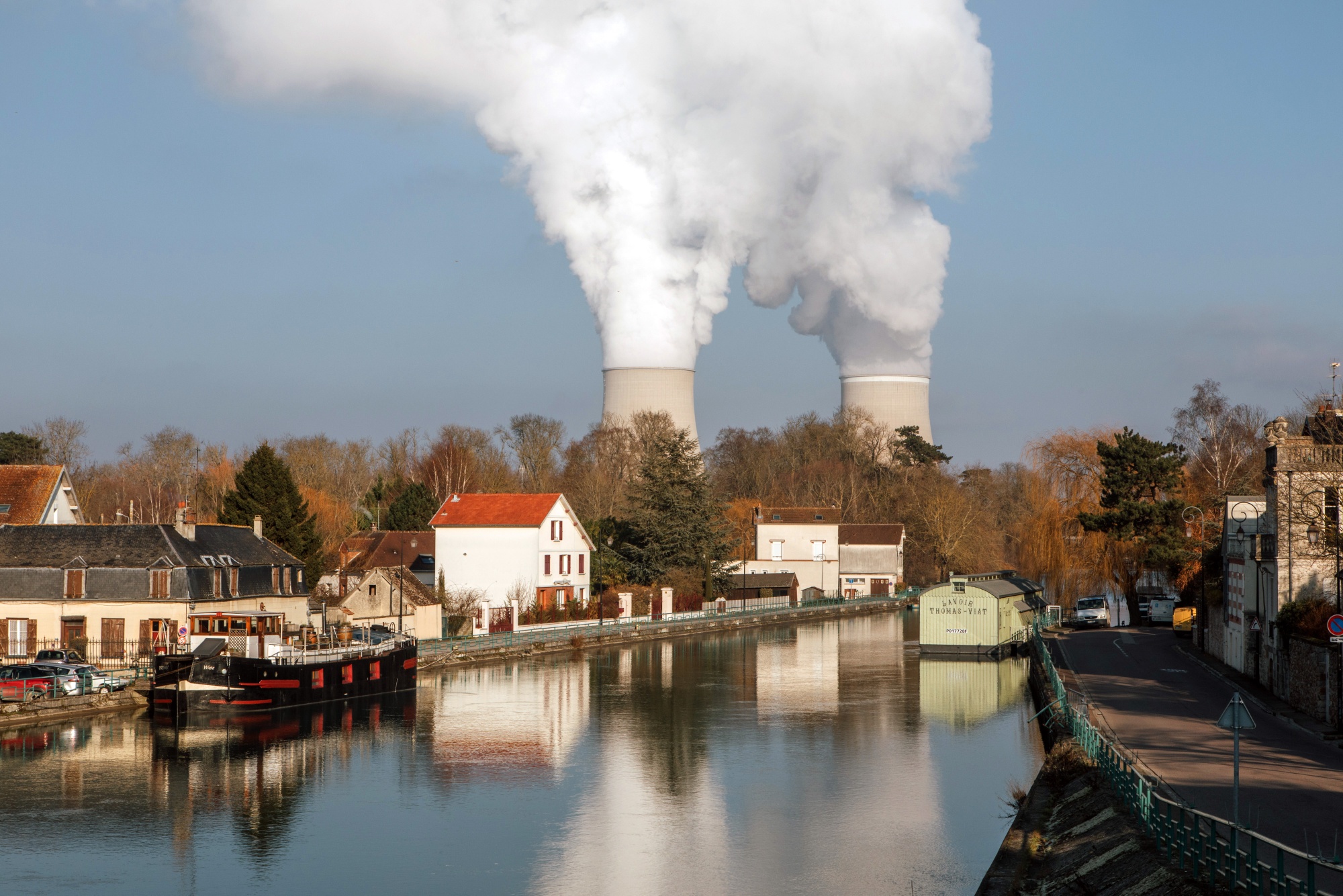 冷却塔在法国Nogent-sur-Seine的核电站释放水蒸气。