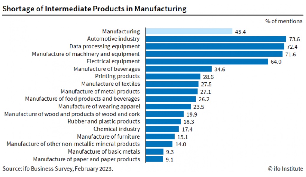 Ifo 德国复苏 | 德国公司报告关键材料短缺的数量已降至自2021年4月以来的最低水平,全球供应链正在从冠状病毒大流行的冲击中恢复。根据Ifo研究所的一项调查,2月份超过45%的公司报告出现短缺,低于一个月前的48.4%。汽车行业的短缺占比最高,几乎四分之三的公司报告出现短缺。