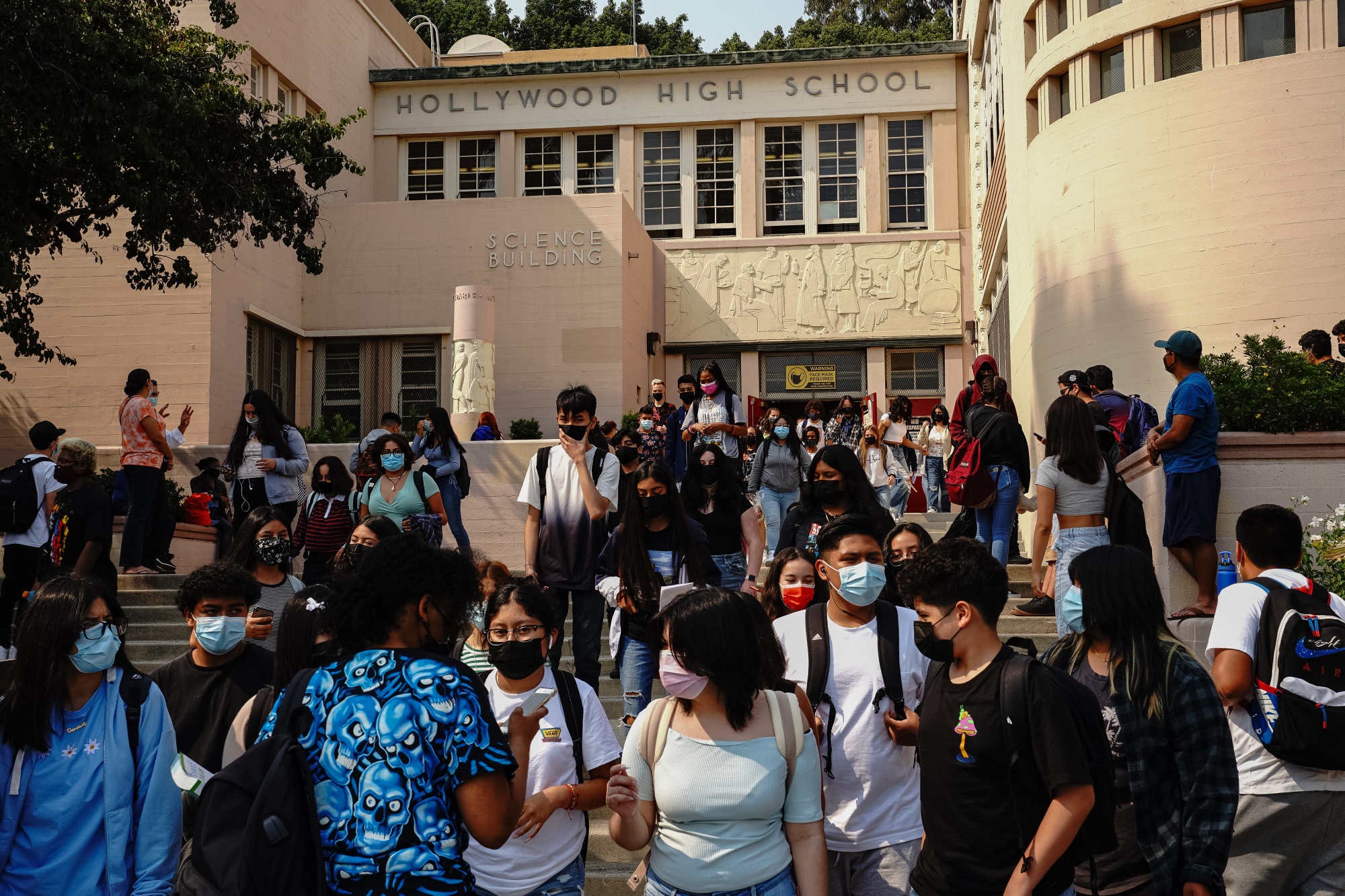 洛杉矶好莱坞高中的学生在第一天放学后离开学校。