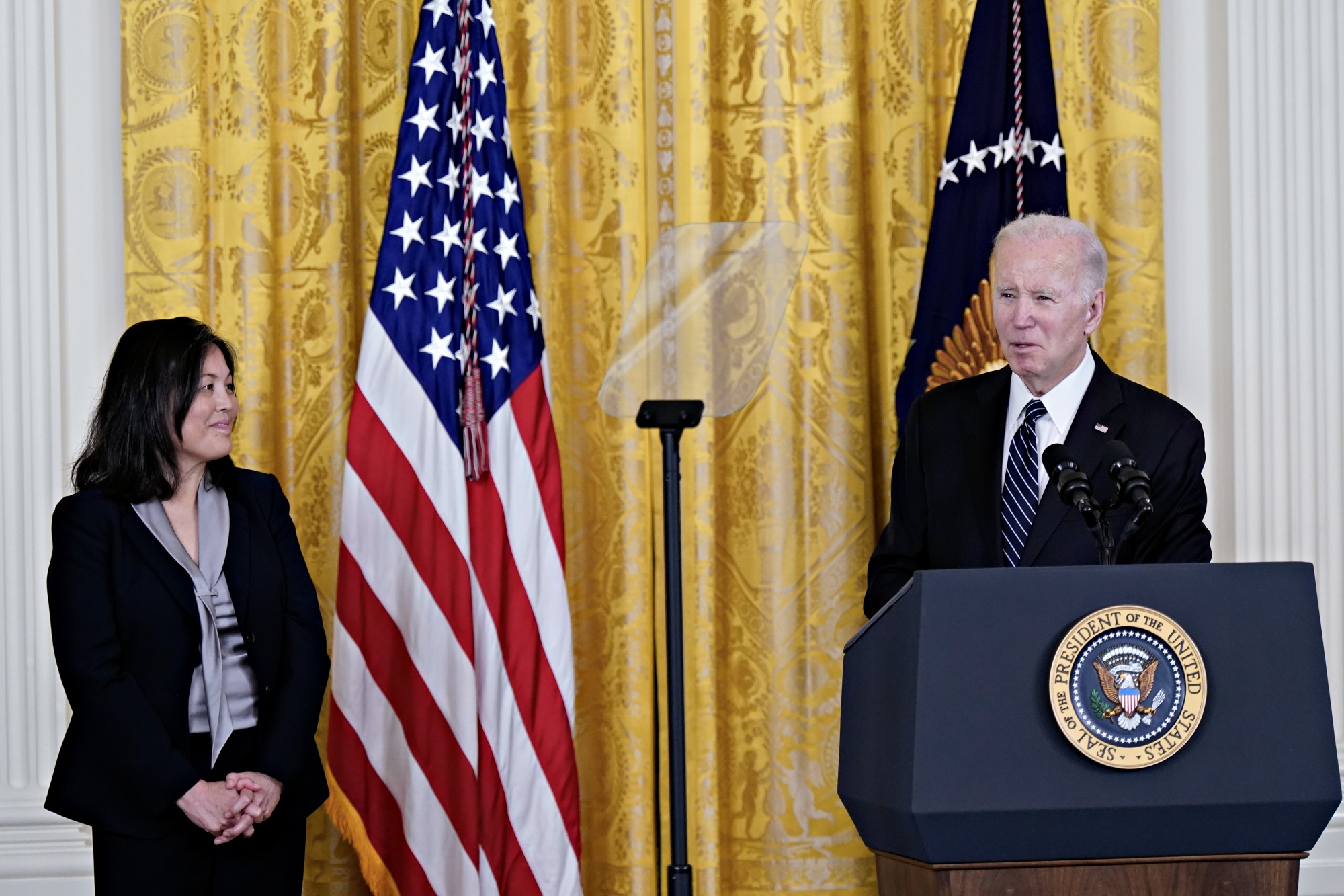 拜登总统在白宫东厅与朱莉·苏举行提名活动,日期为3月1日。摄影师:阿尔·德拉戈/彭博社总统乔·拜登表示,他提名的下一任劳工部长朱莉·苏将致力于保护低收入工人的权利,并促进像半导体制造、宽带和医疗保健这样的高增长行业,如果她被参议院确认。