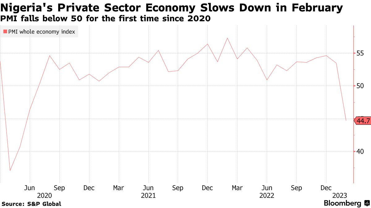 尼日利亚的私营部门活动首次在近三年内出现收缩,公司减少产出并裁员,原因是现金和燃料短缺,这增加了当选总统博拉·蒂努布需要解决的问题清单。