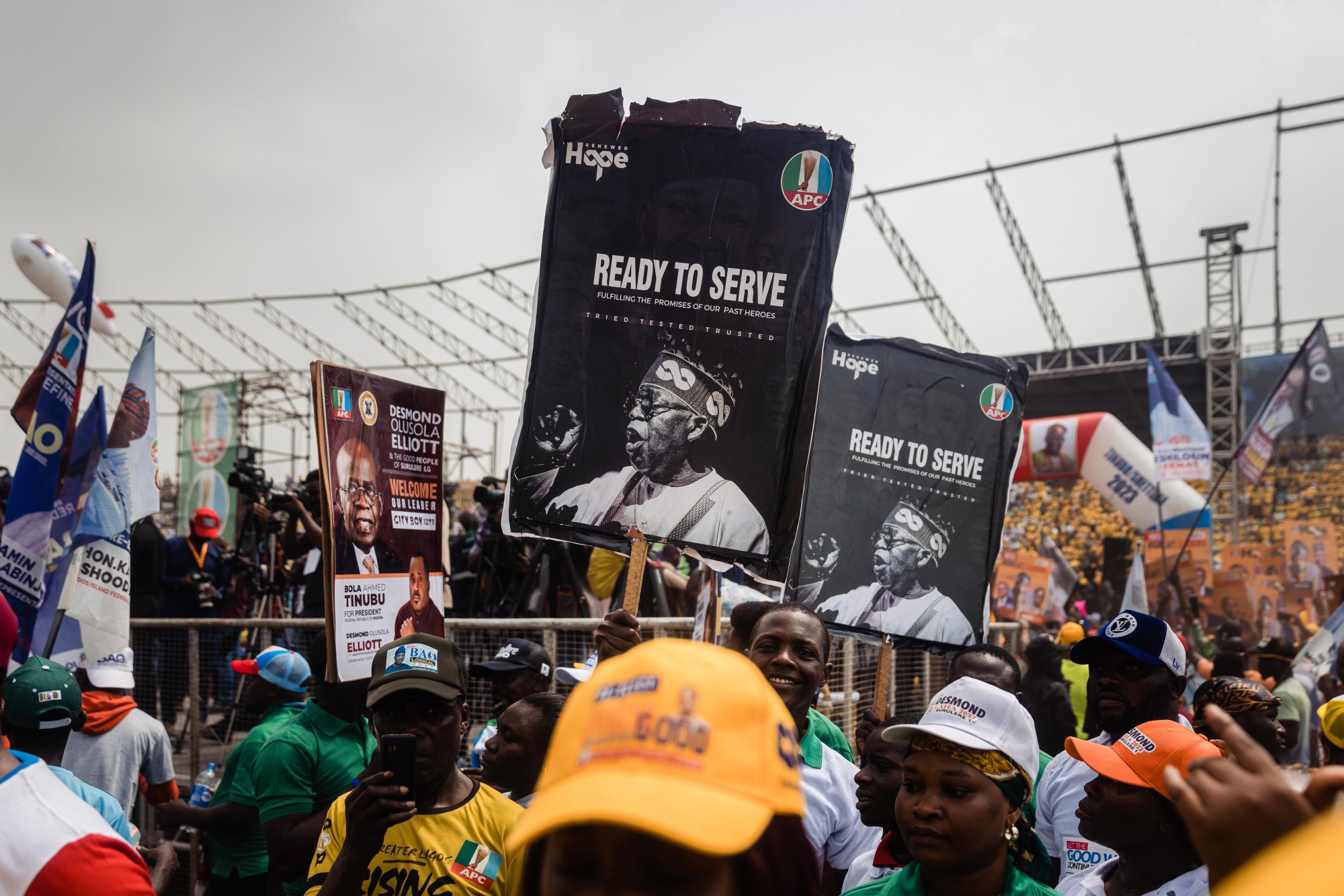 博拉·提努布(Bola Tinubu)是尼日利亚执政党全进步大会(All Progressives Congress)总统候选人,在2月21日在拉各斯举行竞选集会的支持者。