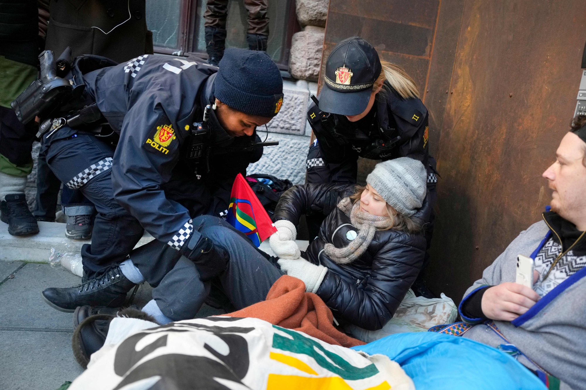 警察在3月1日从奥斯陆财政部外的一场活动中将格蕾塔·桑伯格带走。摄影师:贾瓦德·帕尔萨/NTB/AFP/盖蒂图片社挪威石油和能源部长特尔耶·奥斯兰于周三取消了前往英国的访问,以专注于围绕建在土著土地上的两个巨大风电场引发的愤怒。