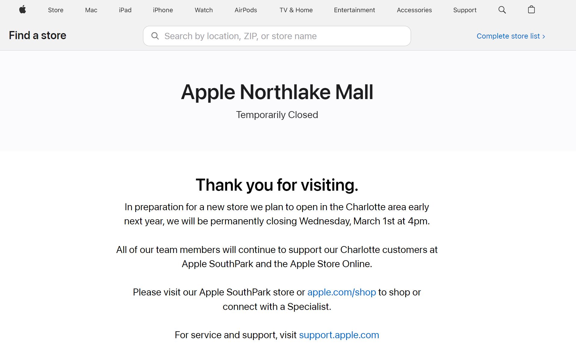 苹果更新了其网站,显示位于Mecklenburg County的Northlake Mall的位置将永久关闭。