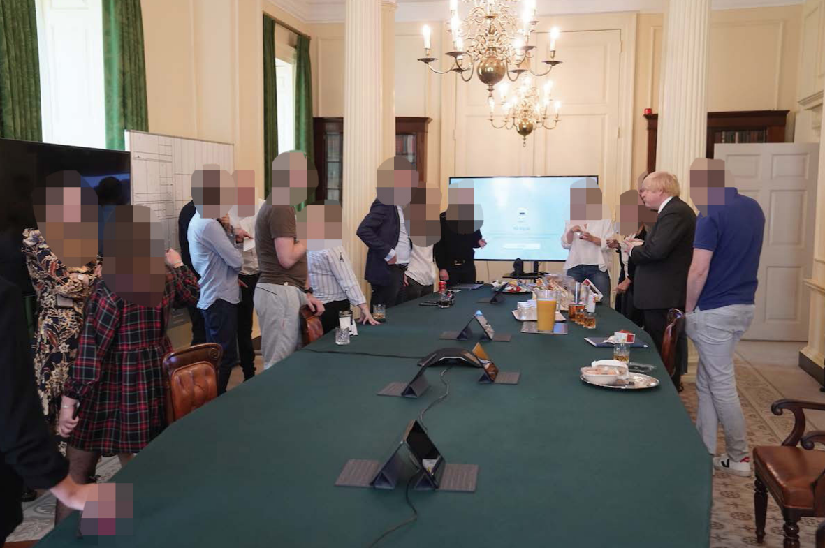 鲍里斯·约翰逊,右二,参加了2020年6月19日在10号的聚会。来源:内阁办公室“证据强烈表明,在他参加这些聚会时,约翰逊显然会意识到违反指导方针的情况,”报告称,在详细列出当时首相可能误导议会或未更正记录的情况之前。