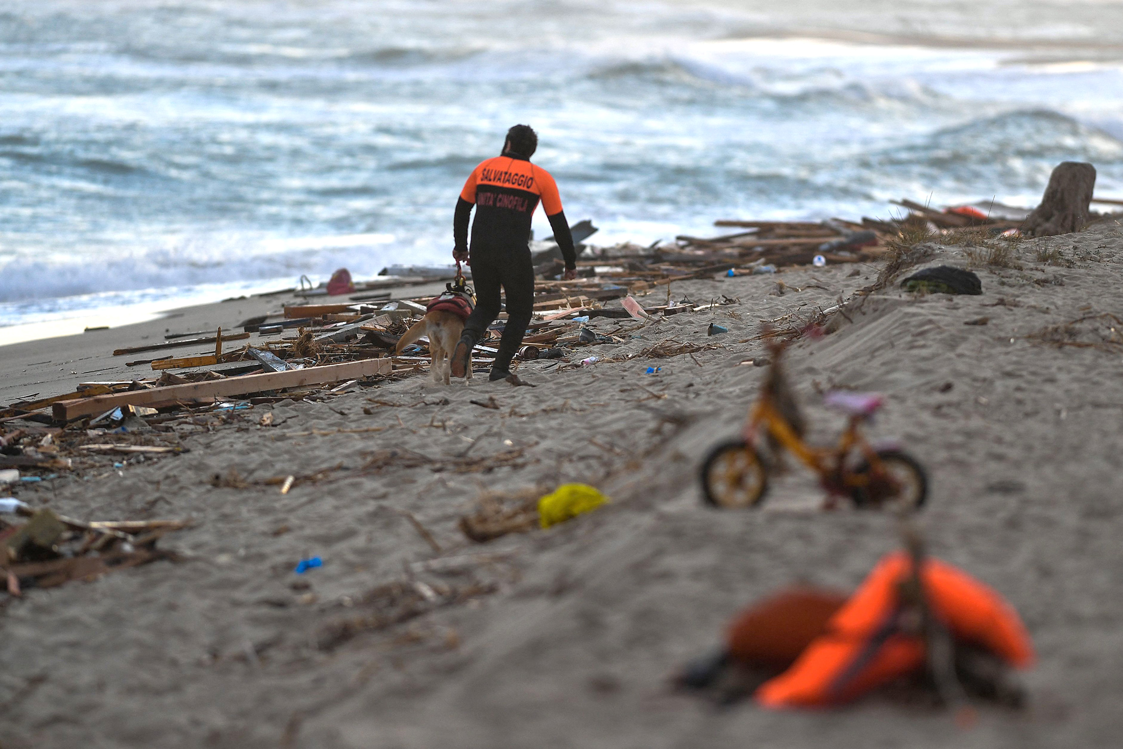 一名警察和他的K-9在意大利卡拉布里亚海岸外一艘移民船只沉没后,沉船残骸被冲上岸的海滩上巡逻,日期为2月26日。