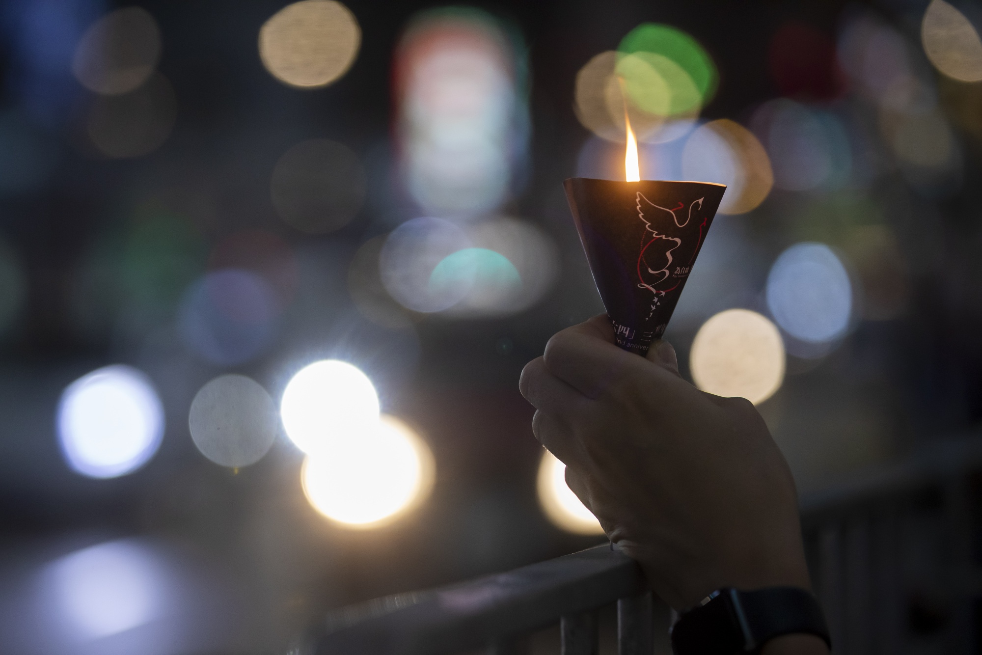 一个人在2021年6月4日在香港维多利亚公园附近举着蜡烛,这里是每年举行天安门烛光晚会的传统场地。