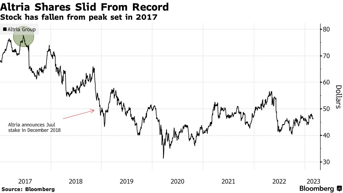 彭博情报公司饮料和烟草高级分析师肯尼斯·谢(Kenneth Shea)在电子邮件中表示,这一退出标志着“Altria与Juul之间长期不幸的投资传奇”。Altria“承认最好是为其获取潜在价值的东西,而不是它可能归零的很大机会。”