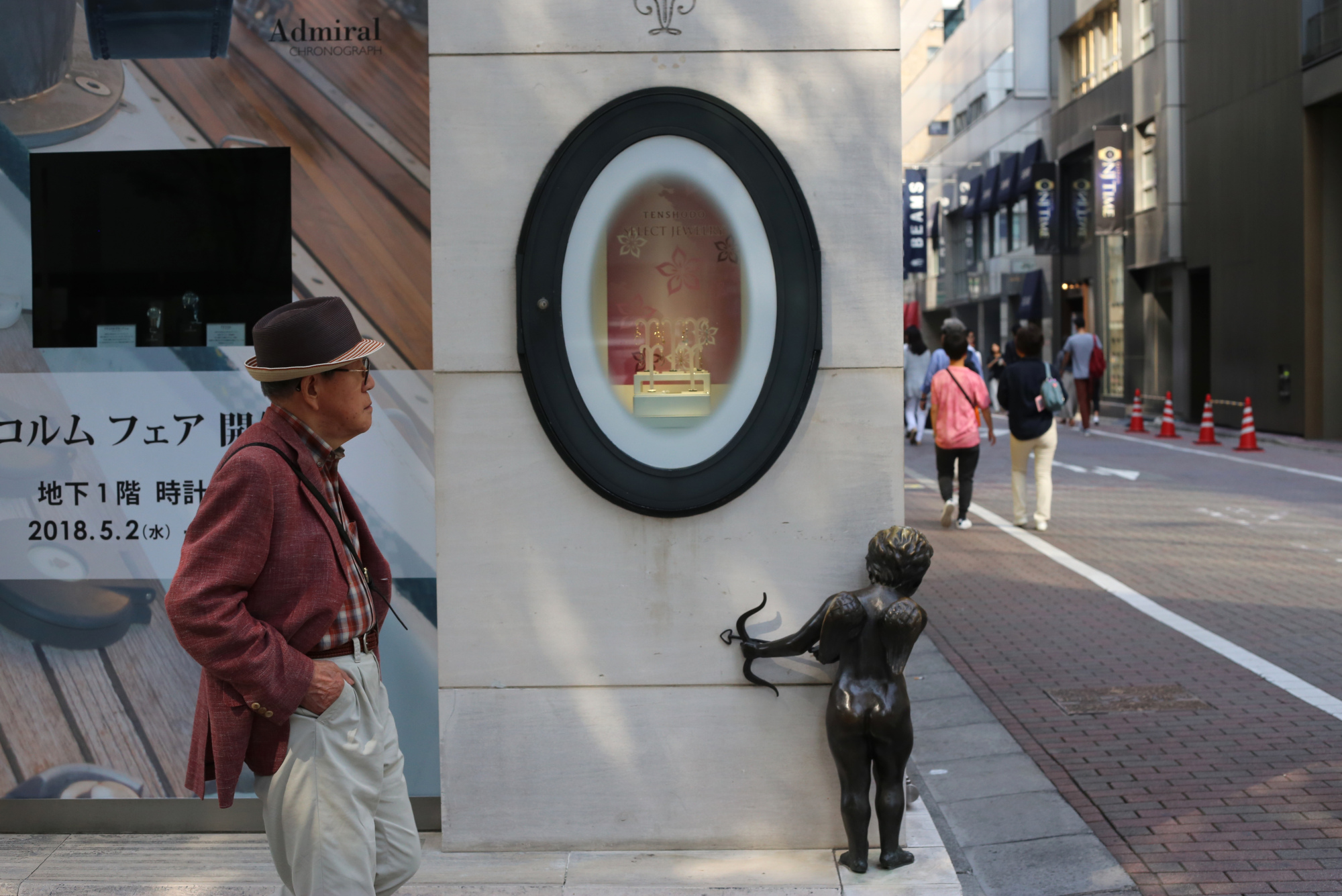 一个行人在2018年走过东京银座区一栋建筑物的一个天使雕像。