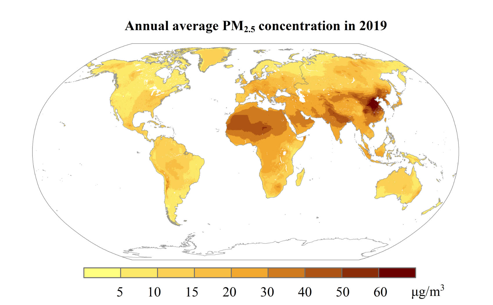 他们还研究了截至2019年的两十年间空气污染的变化。例如,亚洲、北非和撒哈拉以南的非洲、大洋洲、拉丁美洲和加勒比地区的大部分地区在过去20年中PM2.5浓度增加,部分原因是野火加剧。欧洲和北美的年度PM2.5浓度和高PM2.5天数减少,得益于更严格的法规。细颗粒物由车辆排放的烟尘、野火和生物质炊炉污染的烟雾和灰烬、发电厂的硫酸盐气溶胶以及沙漠尘埃组成。