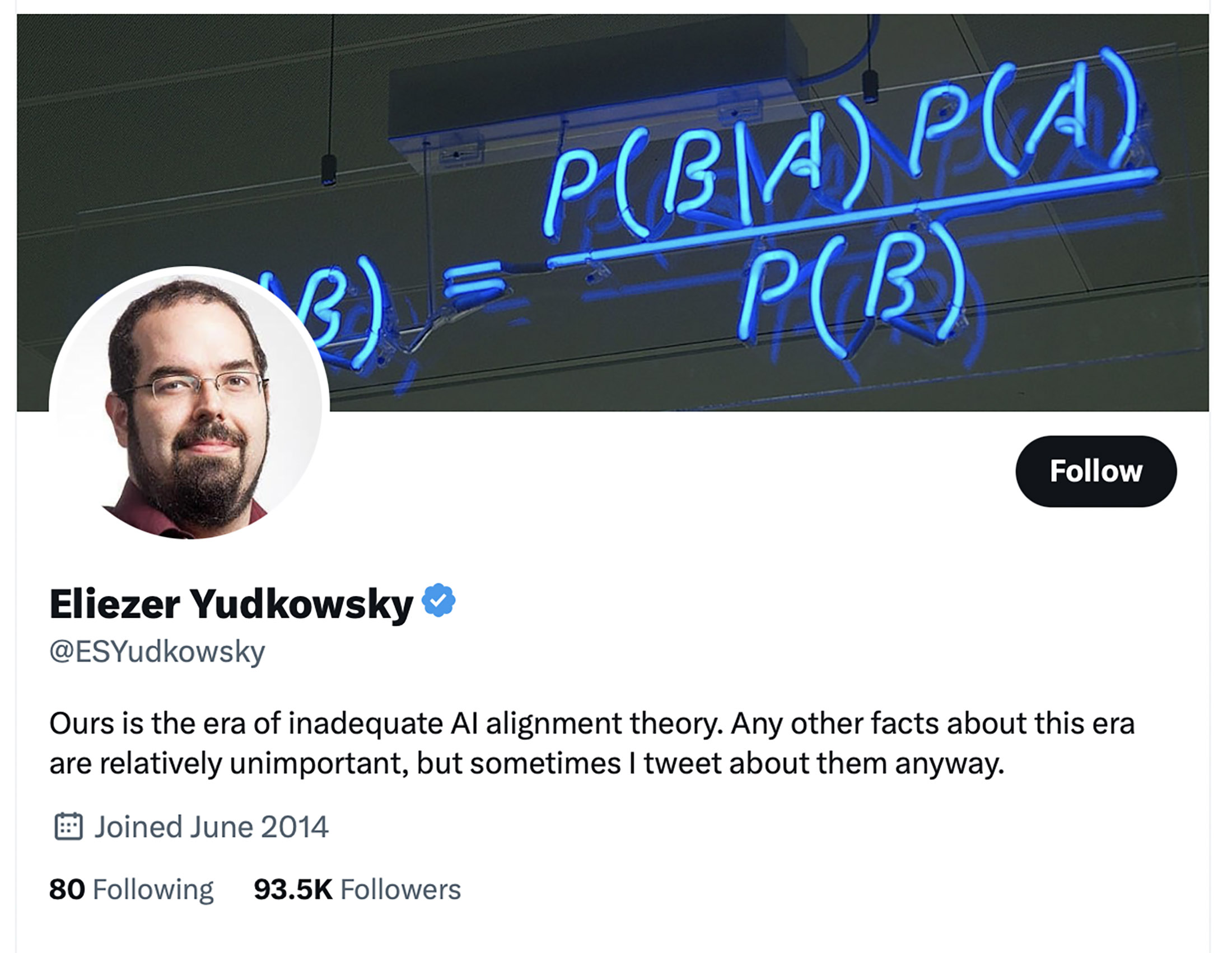 1979年出生于芝加哥的尤德科夫斯基(Yudkowsky)在青少年时期放弃了摩登正统犹太教,成为了一名无神论者。他没有完成高中学业,但在十几岁时开始对“奇点”这一概念产生了浓厚兴趣,奇点是指技术进步将不可避免地导致超人类智能的那一刻。他在2000年代开始认真地撰写有关人工智能的文章,这时已经有了HAL 9000、天网和黑客帝国等作品进入公众视野,但他的作品量却引人注目。在数年里,他每天都发表简洁的博客文章,主张研究人员应尽一切努力确保人工智能与人类价值“对齐”。为此,他在加利福尼亚州伯克利创建了 机器智能研究所(MIRI),最初得到了来自蒂尔(Thiel)和Skype联合创始人扬·塔林(Jaan Tallinn)的资助。