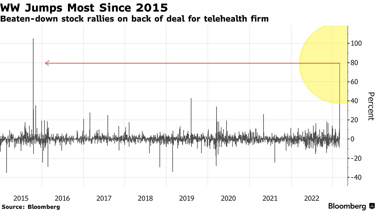 WW International Inc.,之前被称为WeightWatchers,在与一家远程医疗服务提供商达成了一项价值1.32亿美元的交易后,股价飙升,创下七年来最大涨幅。