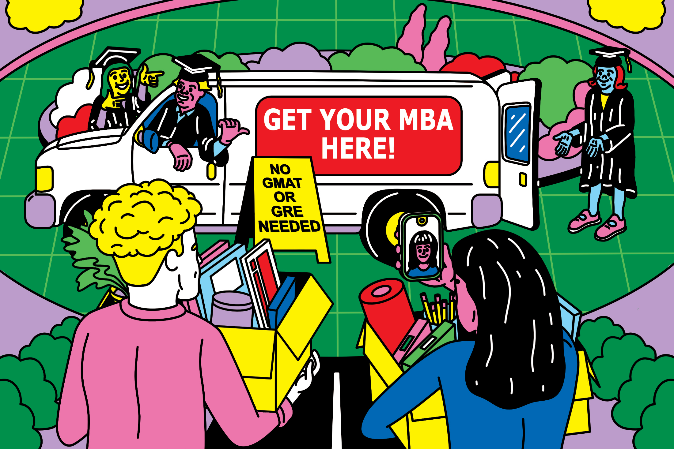 插图:James Clapham 为彭博商业周刊绘制批评者表示,为最近失去科技工作的工人降低商学院入学门槛对仍在工作的申请人不公平,而且显得不择手段。