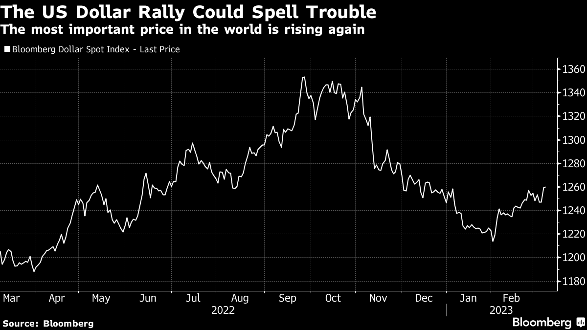 此外,还有一个问题,那就是“世界上最重要的价格” —— 美元与其他全球货币的汇率。去年九月底,美元达到了顶峰。这大致与市场中的其他一切变得稍微好转相吻合,并一直持续下滑直到一月底。