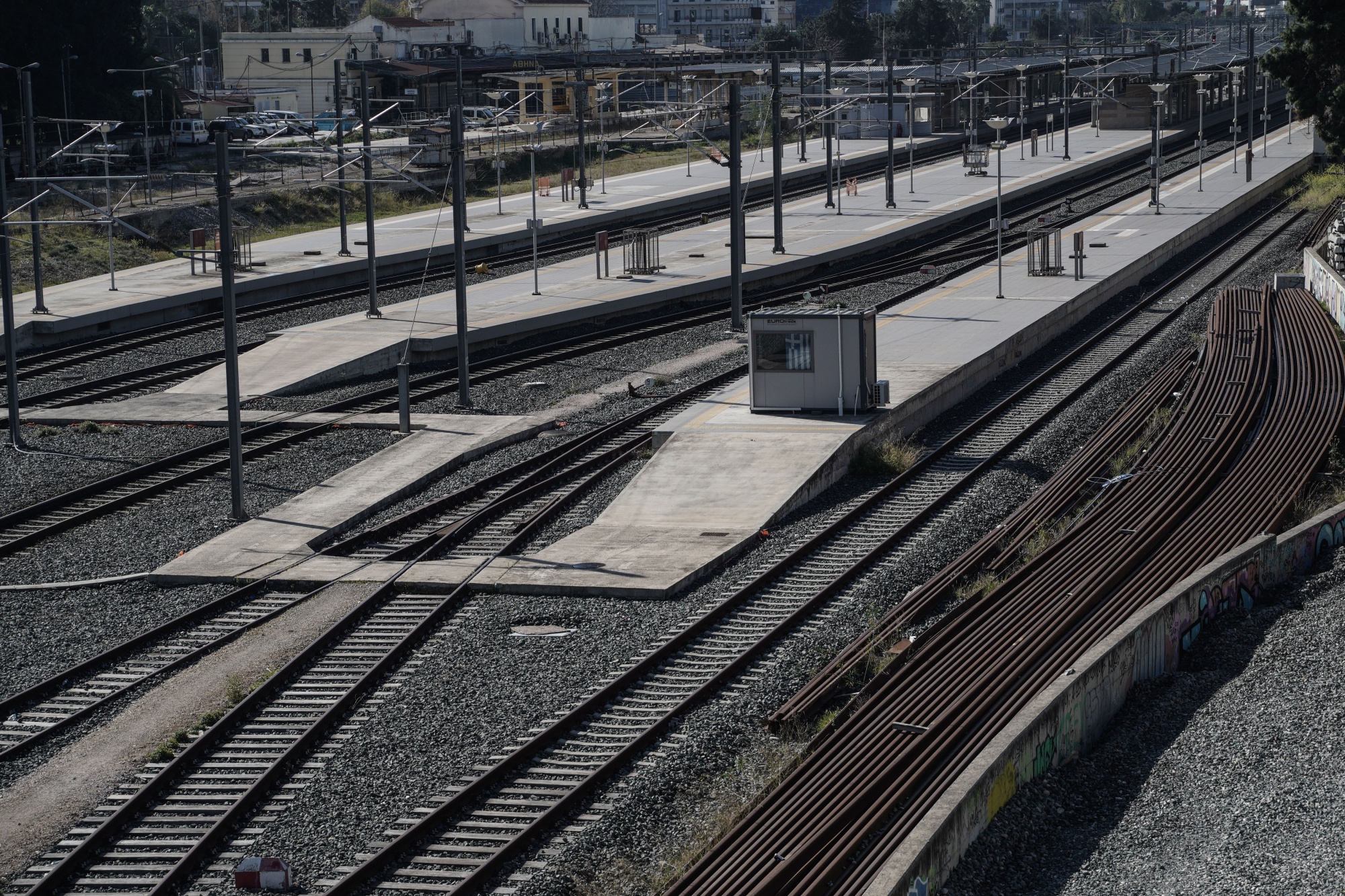 雅典中央火车站,也称为拉里萨车站,在24小时罢工期间的空荡荡的站台,希腊雅典,3月8日。
