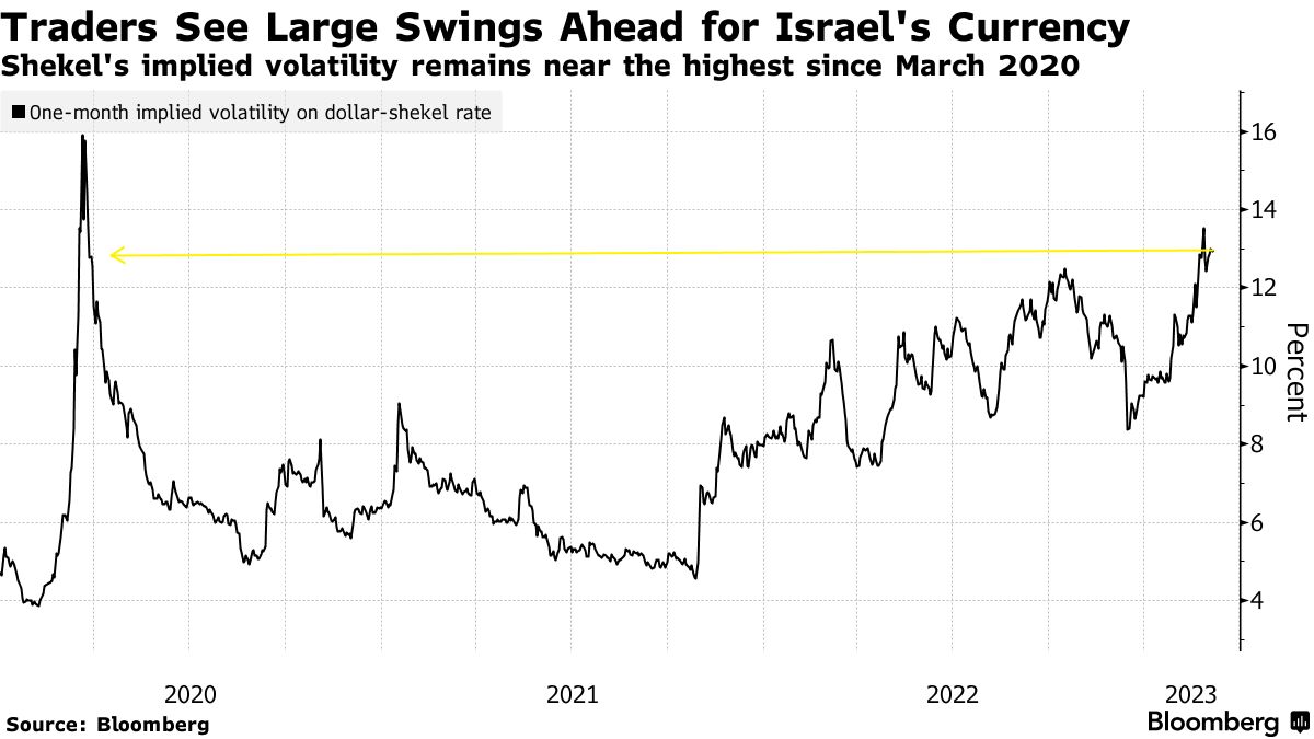 谢克尔在过去一个月中是世界上表现最差的货币之一,然后在最近几天收回了一些损失。该货币的一个月隐含波动性仍然接近2020年3月以来的最高水平。