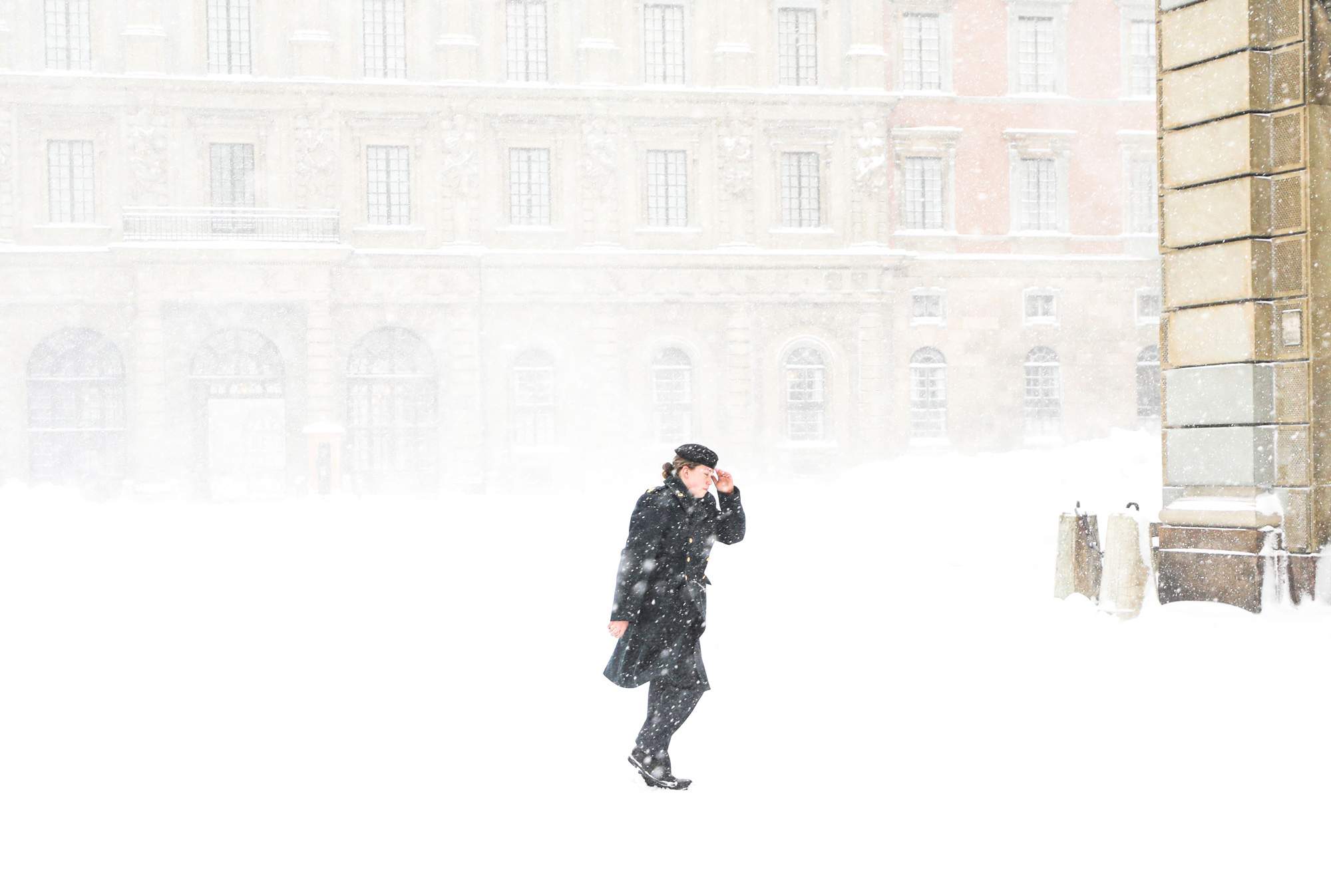 一名皇家卫兵穿过斯德哥尔摩皇宫外大雪纷飞的场景,拍摄于3月8日。
