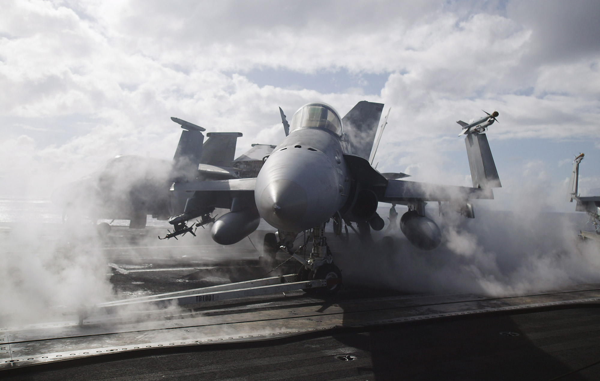 一架战斗机被甲板上的蒸汽包围,这是在夏威夷附近的约翰·C·斯坦尼斯号航空母舰上拍摄的。
