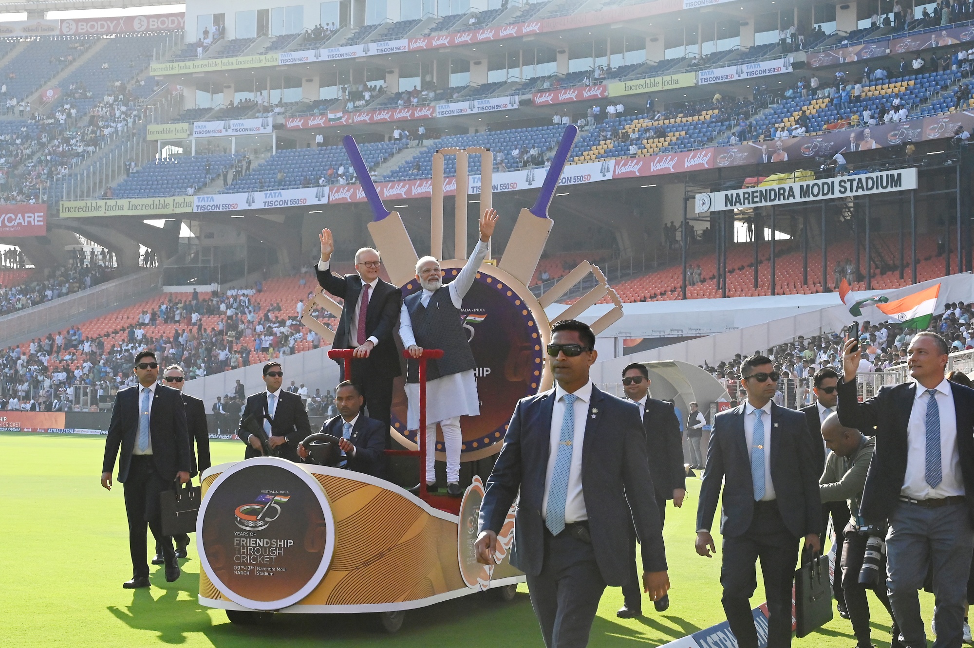 安东尼·阿尔巴尼斯,中间左侧,与纳伦德拉·莫迪一起,在艾哈迈达巴德的纳伦德拉·莫迪体育场,于3月8日观看印度对澳大利亚第四次测试比赛。摄影师:普拉卡什·辛格/彭博社周四,在前往维克兰特号航母之前,阿尔巴尼斯前往艾哈迈达巴德与莫迪会面,观看印度和澳大利亚之间第四次板球测试赛的开始。两位领导人乘坐闪闪发光的金色战车进入以莫迪命名的体育场,受到了热烈的掌声。