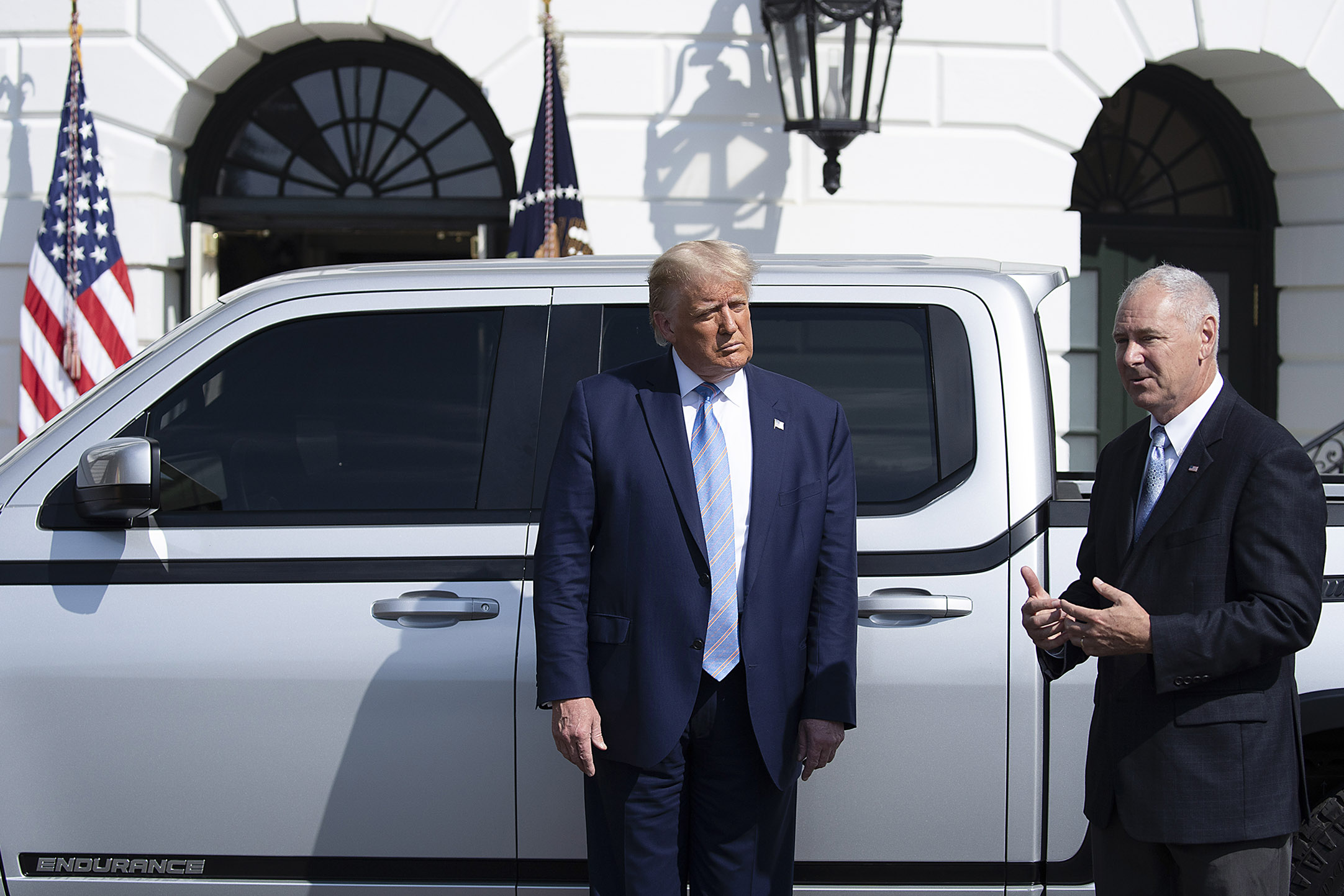 唐纳德·特朗普和Lordstown Motors创始人史蒂夫·伯恩斯,站在2020年9月在白宫前的一辆Endurance皮卡前。