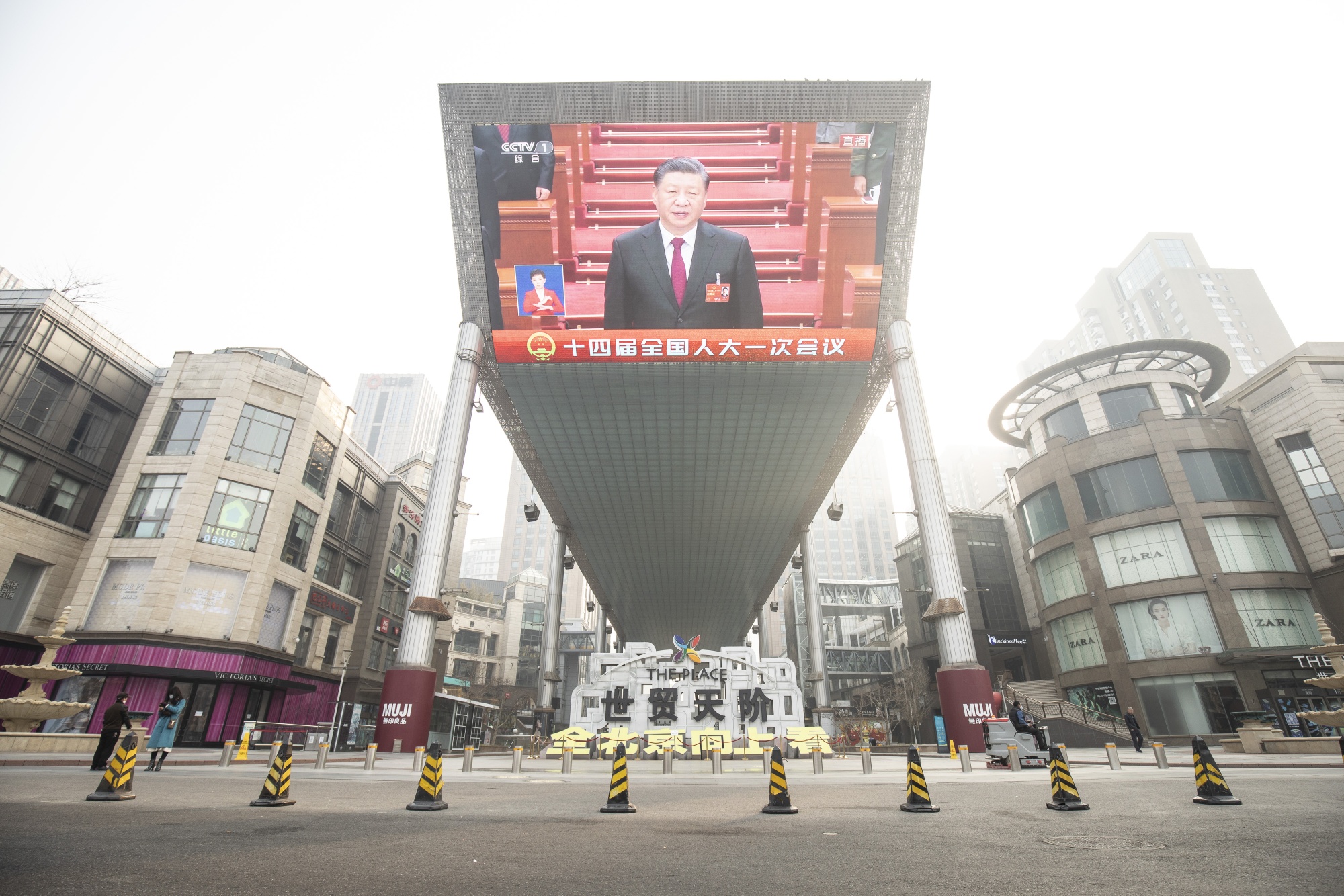 屏幕显示了中国国家主席习近平在3月5日北京全国人大开幕式上的新闻广播。